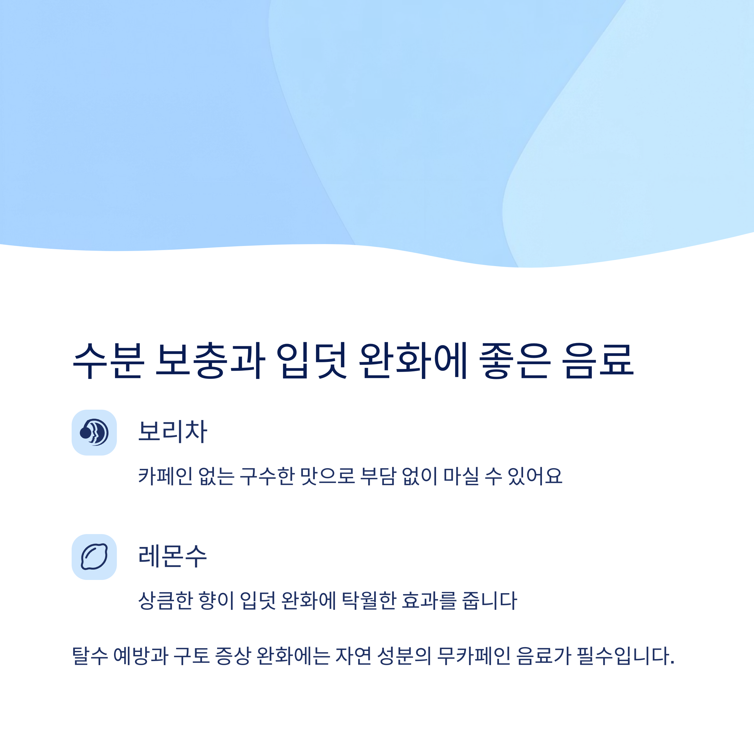 핵심: "탈수 예방과 구토 증상 완화에는 자연 성분의 무카페인 음료가 필수입니다."