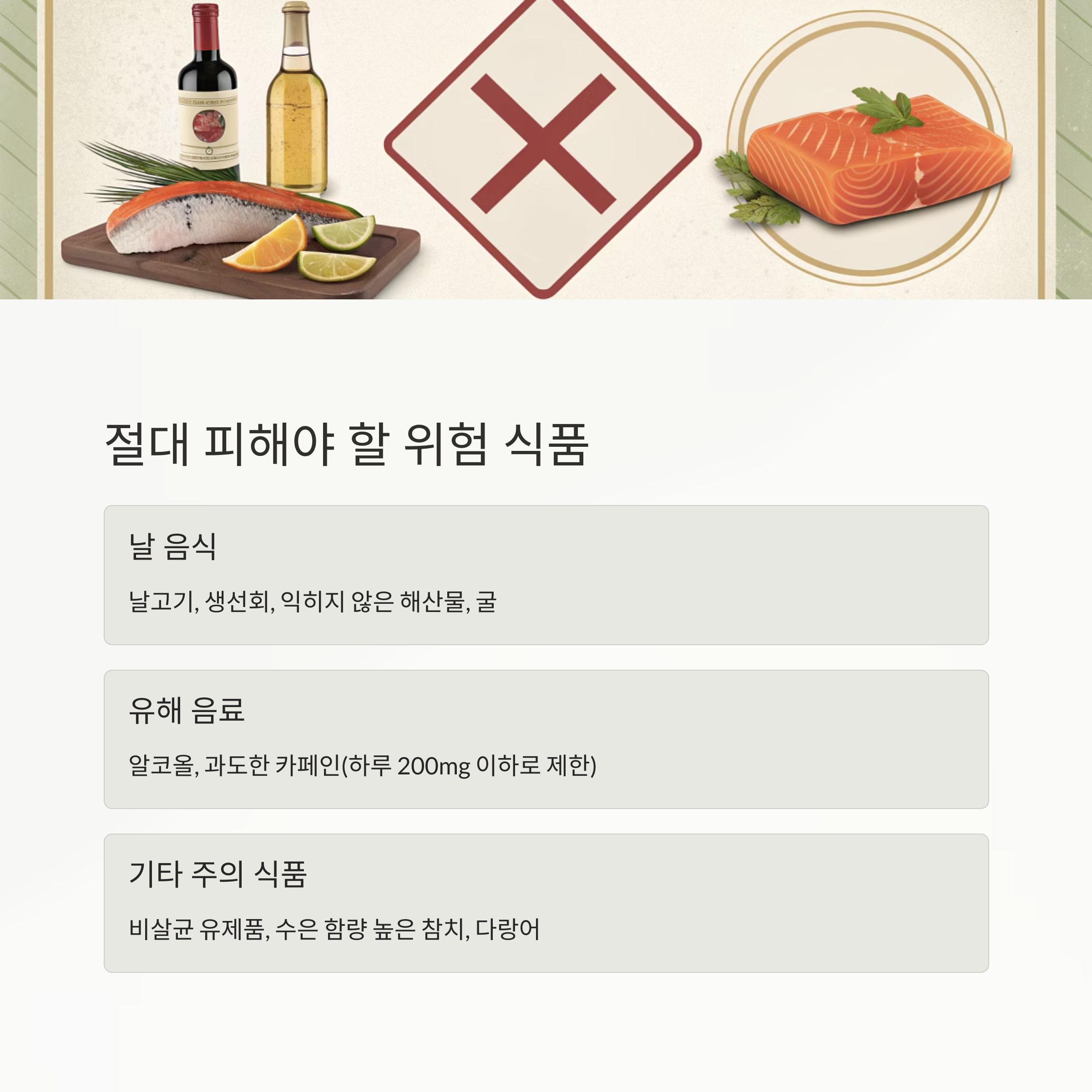특히 알코올과 비살균 유제품은 감염이나 기형 발생과 관련이 깊으므로 철저히 배제해야 합니다.