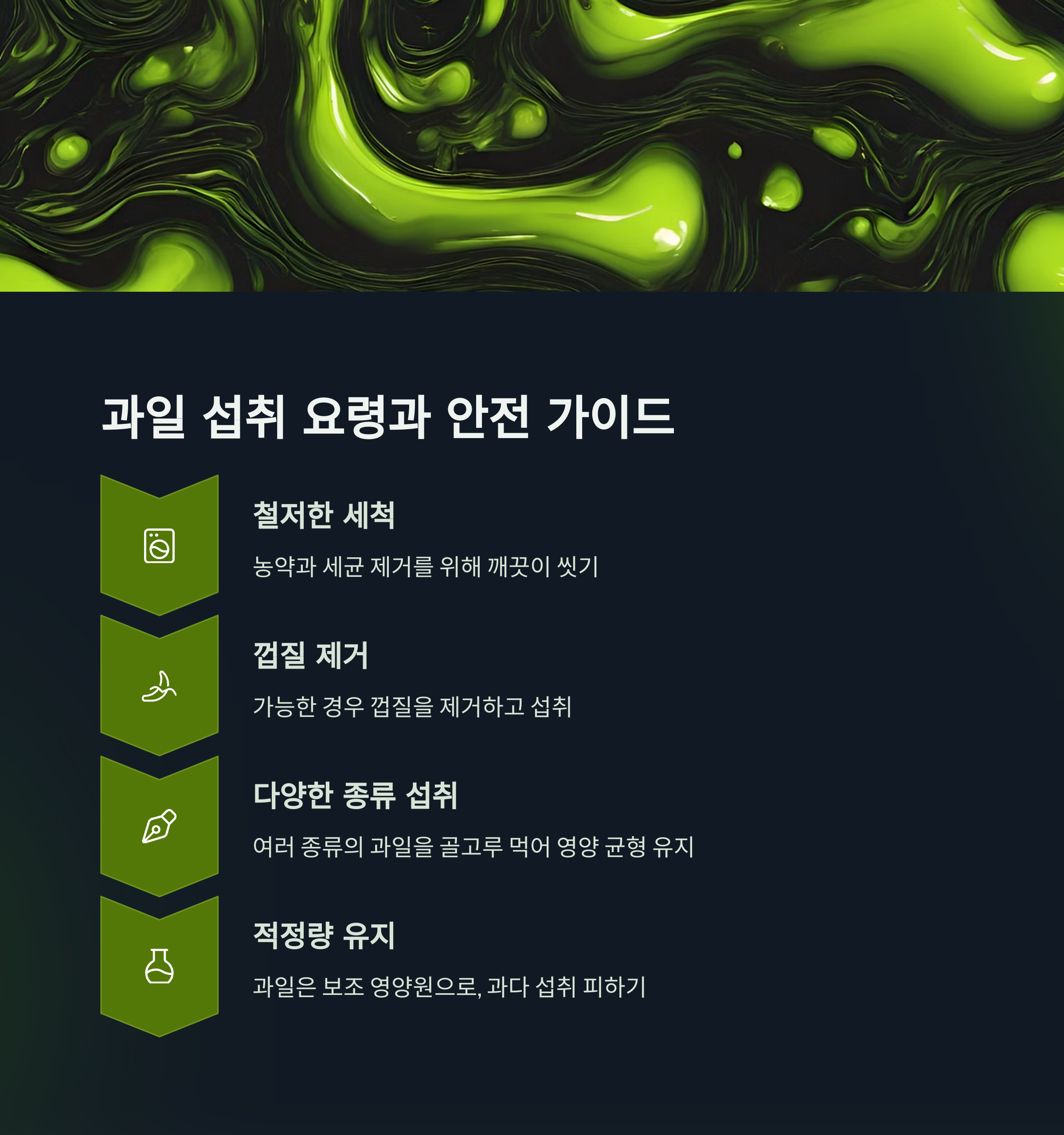 과일은 식사 대용이 아닌 보조적인 영양 공급원으로 생각하고, 다양한 종류를 골고루 섭취하세요.