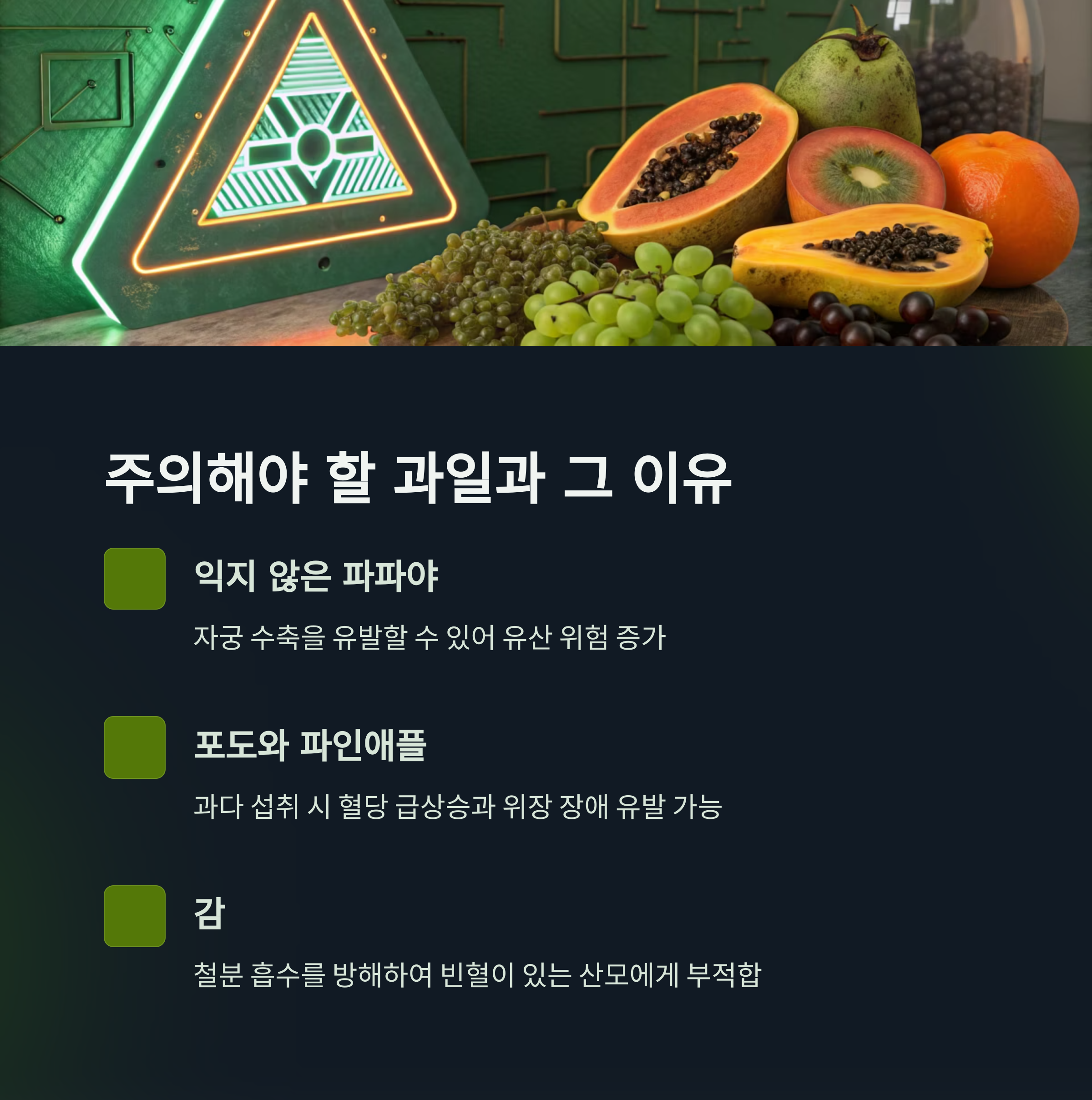 익지 않은 파파야는 자궁 수축을 유발할 수 있고, 포도나 파인애플을 과다 섭취하면 혈당이 급격히 오르거나 위장 장애를 유발할 수 있습니다.