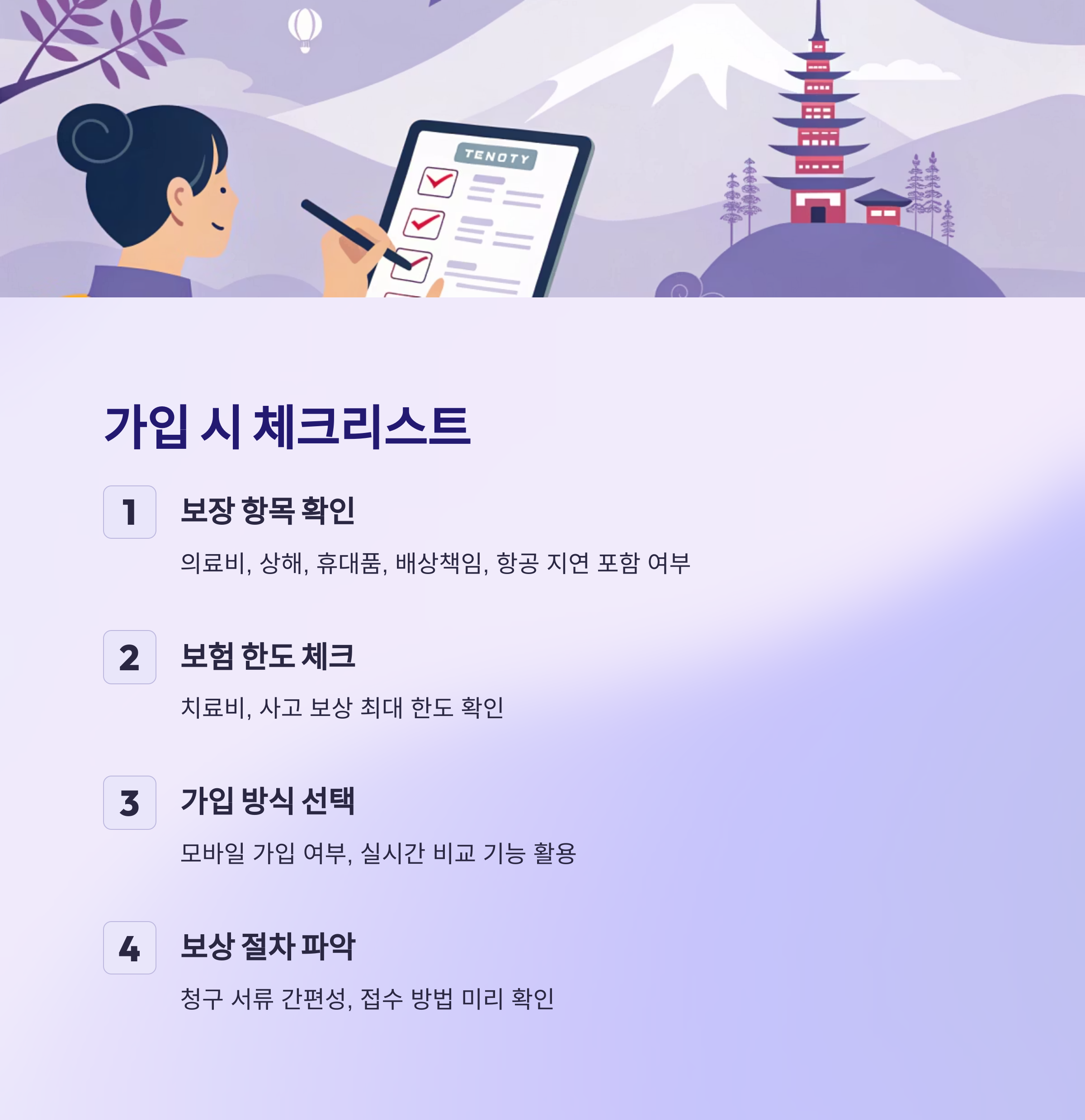 “휴대품 손해(휴대폰, 카메라 등), 항공편 지연 보상, 배상 책임은 꼭 체크하세요.”