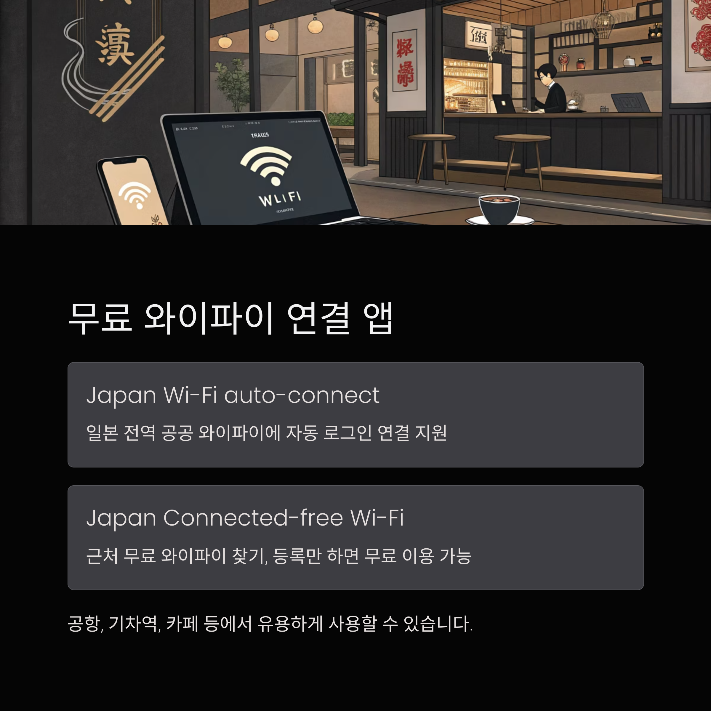 일본은 유료 와이파이가 많지만, 전용 앱을 설치하면 공공 와이파이에 자동 연결이 가능합니다.