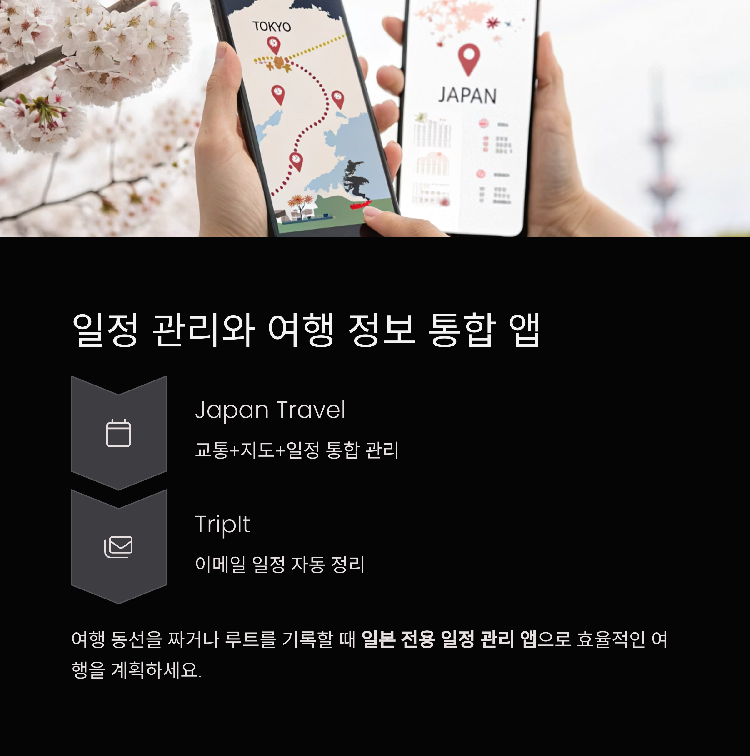 | Japan Travel(NAVITIME) | 일정 관리, 경로 저장 | 교통+지도+일정 통합 관리 |