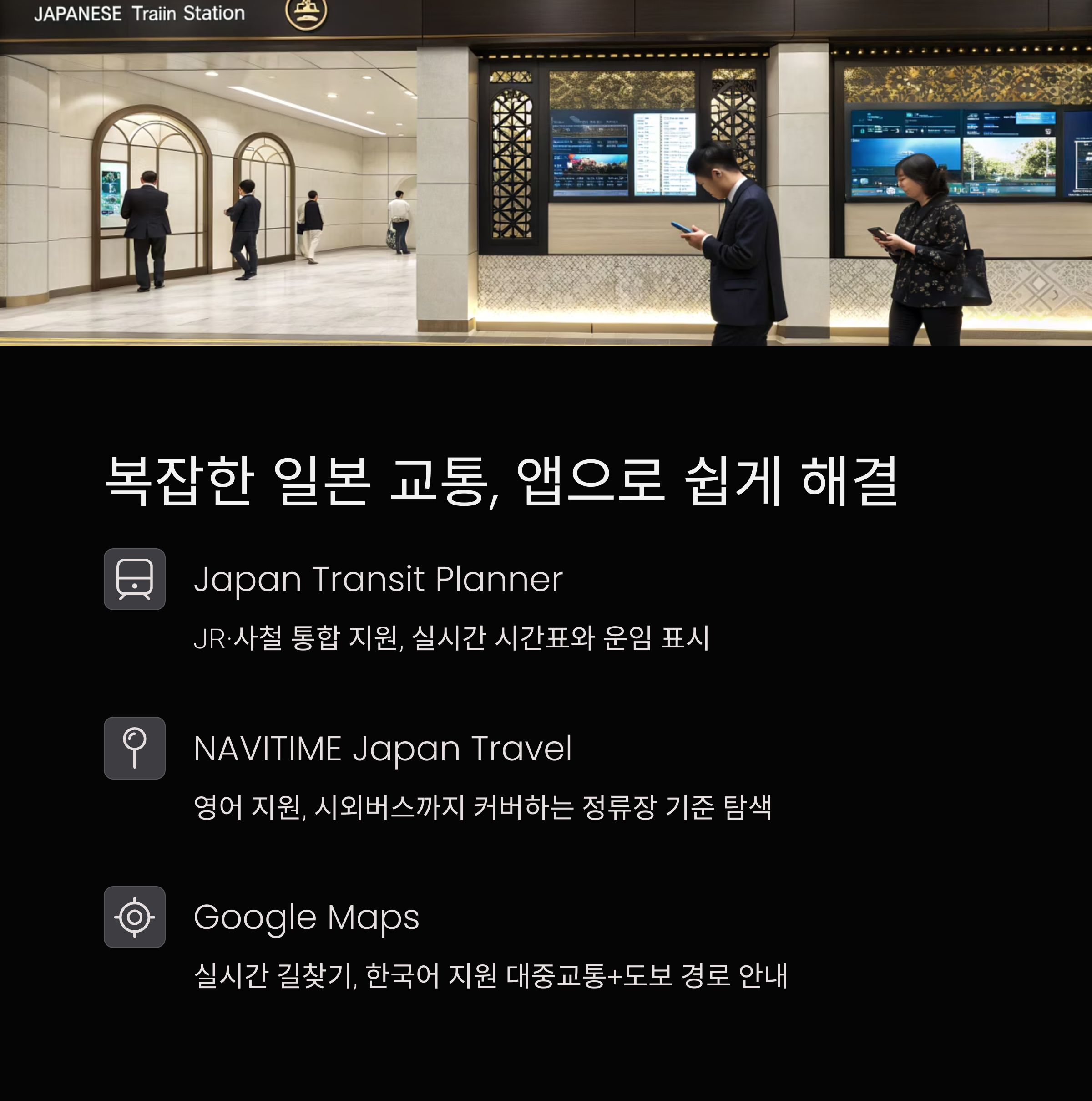 | Japan Transit Planner | 환승 검색, 운임 표시 | JR·사철 통합 지원, 시간표 실시간 |