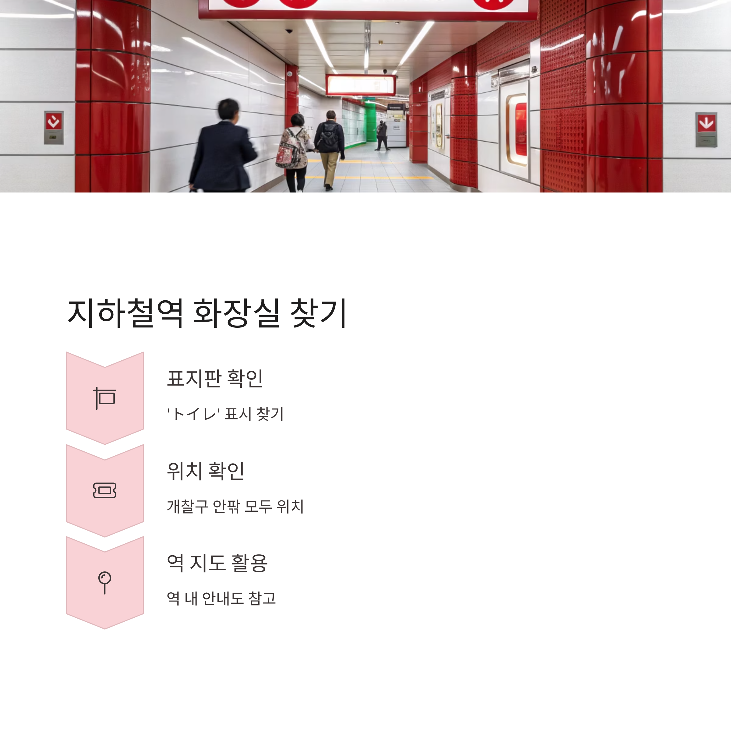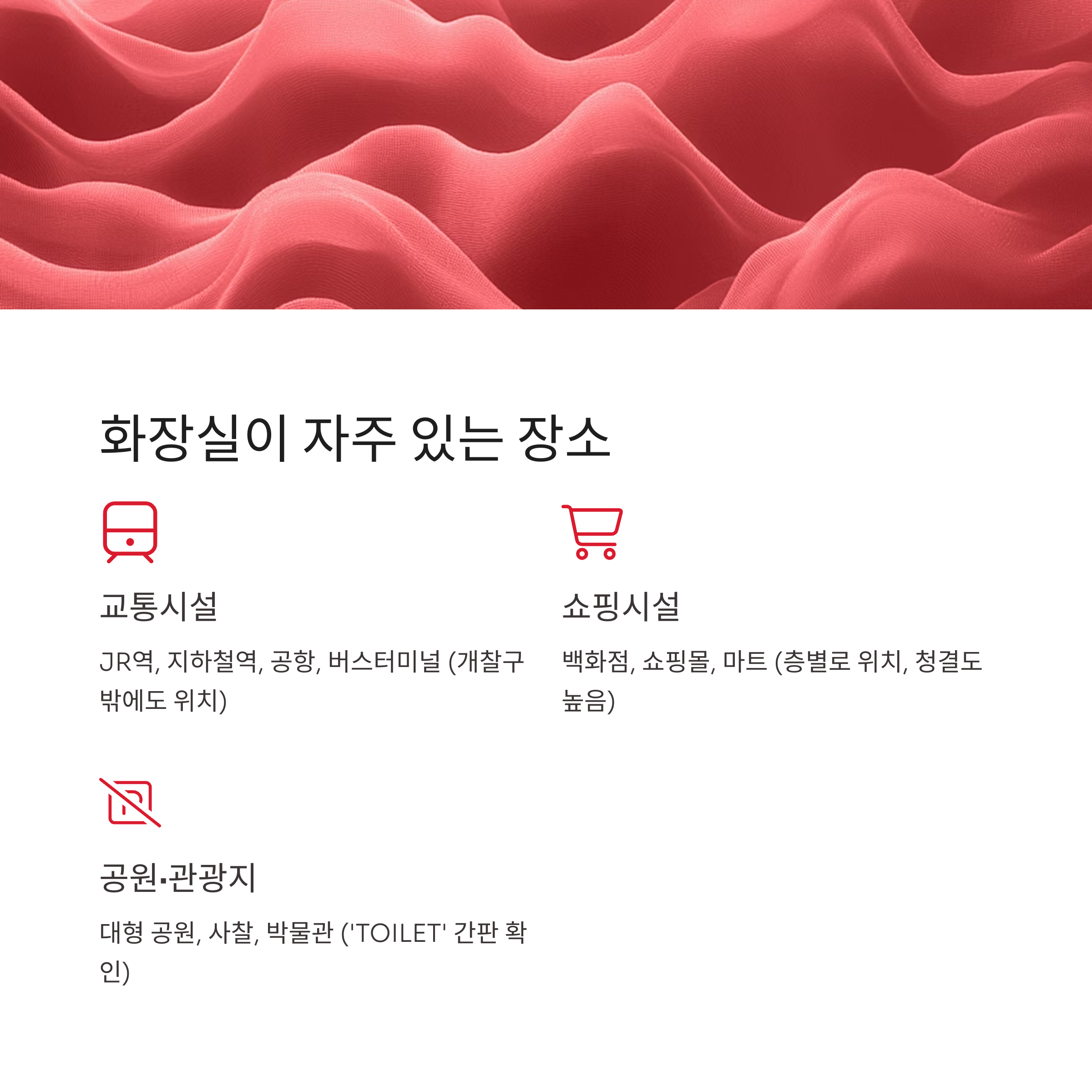 일본은 공공 화장실 인프라가 잘 갖춰진 나라로, 대부분 무료로 이용 가능하고 청결도도 뛰어납니다.