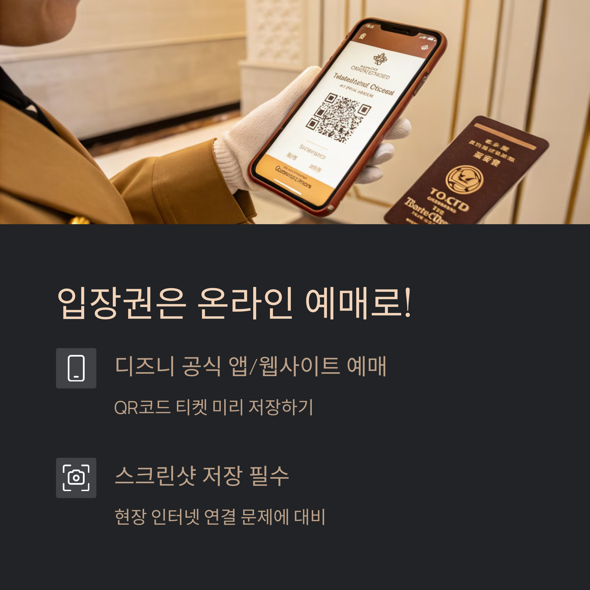 입장권은 현장 구매보다 디즈니 공식 앱 또는 공식 웹사이트 예매 가 훨씬 유리합니다