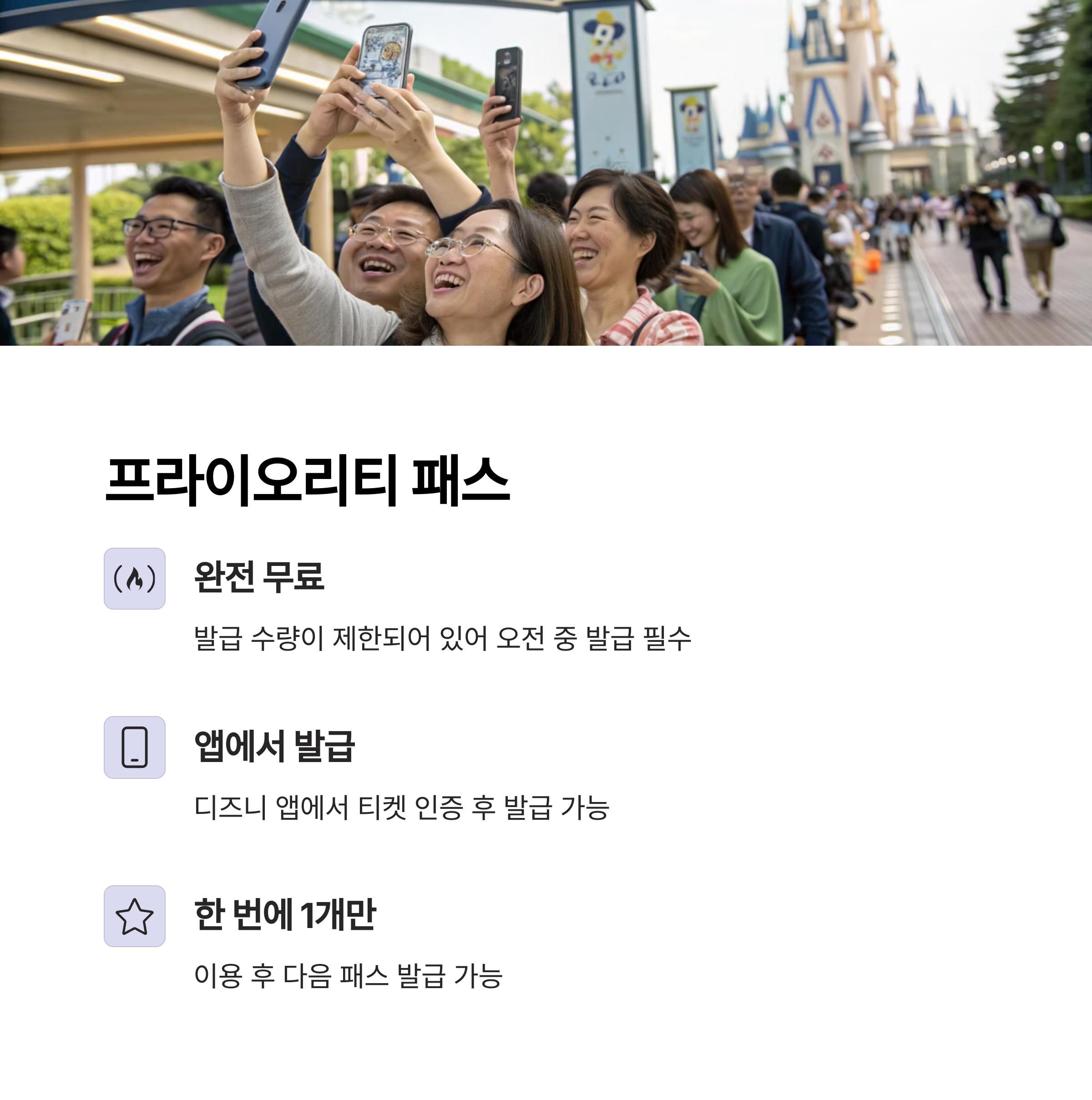| 프라이오리티 패스 | 무료 | 지정 시간에 대기 단축 입장 가능 | 앱에서 티켓 인증 후 발급 |