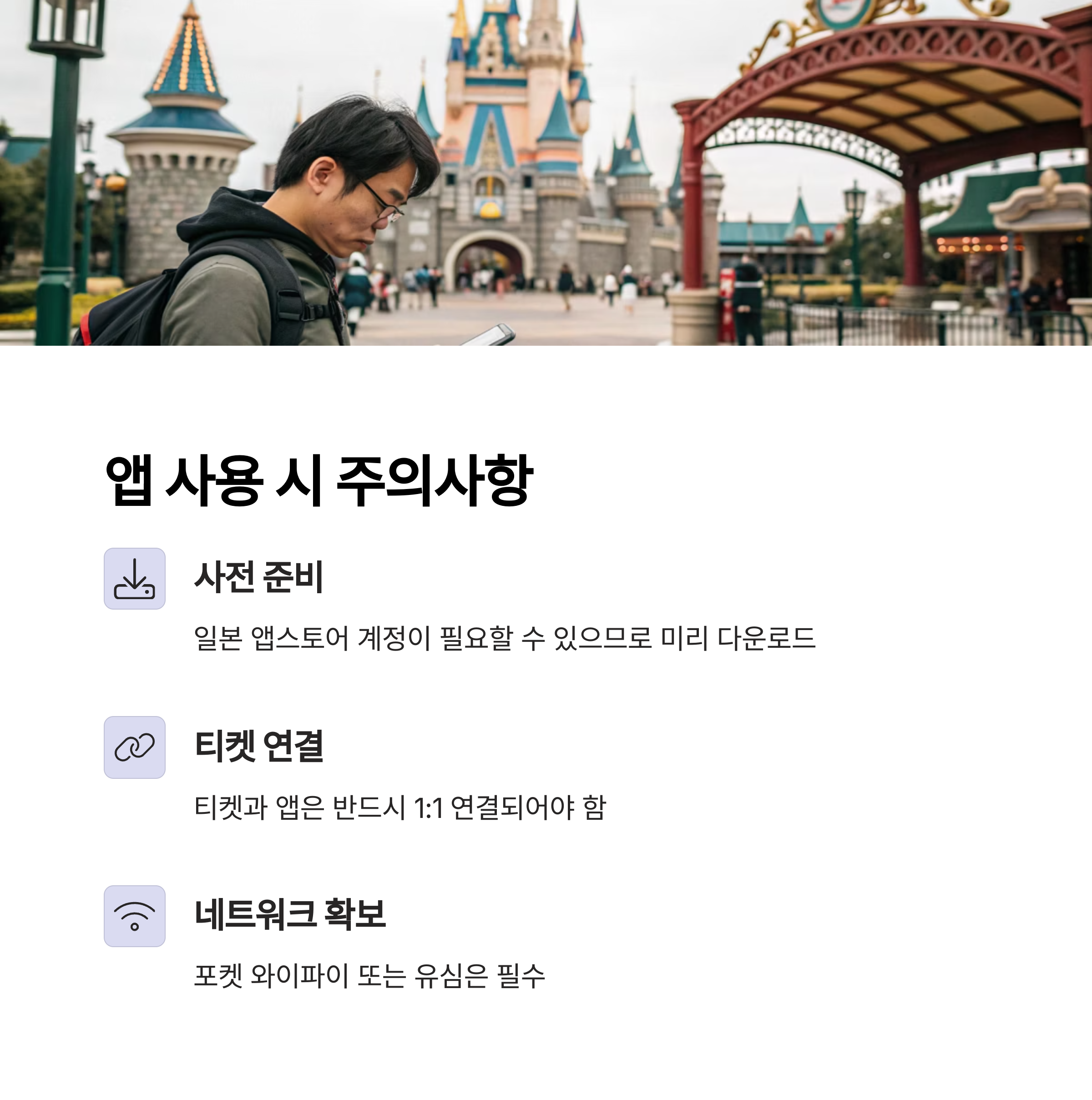 모든 패스 시스템은 디즈니 공식 앱에서 이용자 티켓 인증 후 사용 가능합니다.