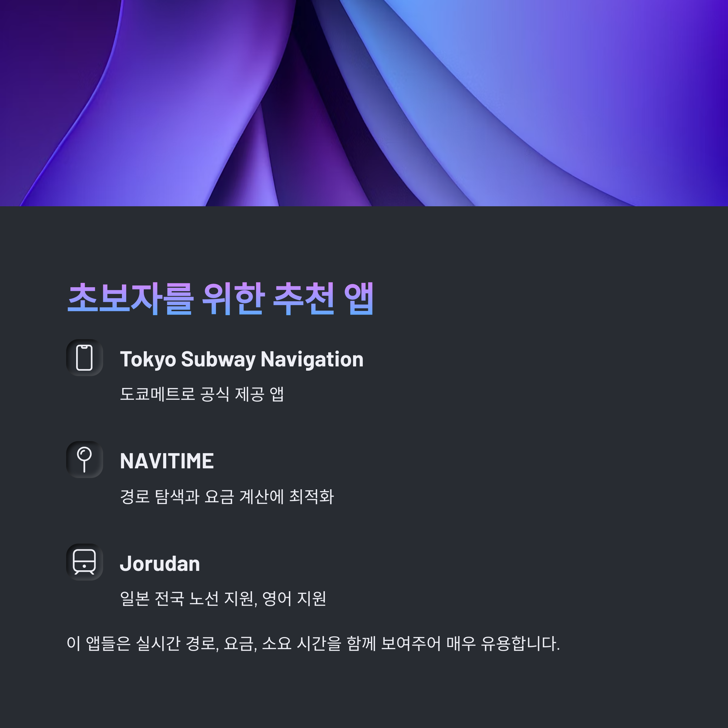 - Tokyo Subway Navigation 앱: 도쿄메트로 공식 제공