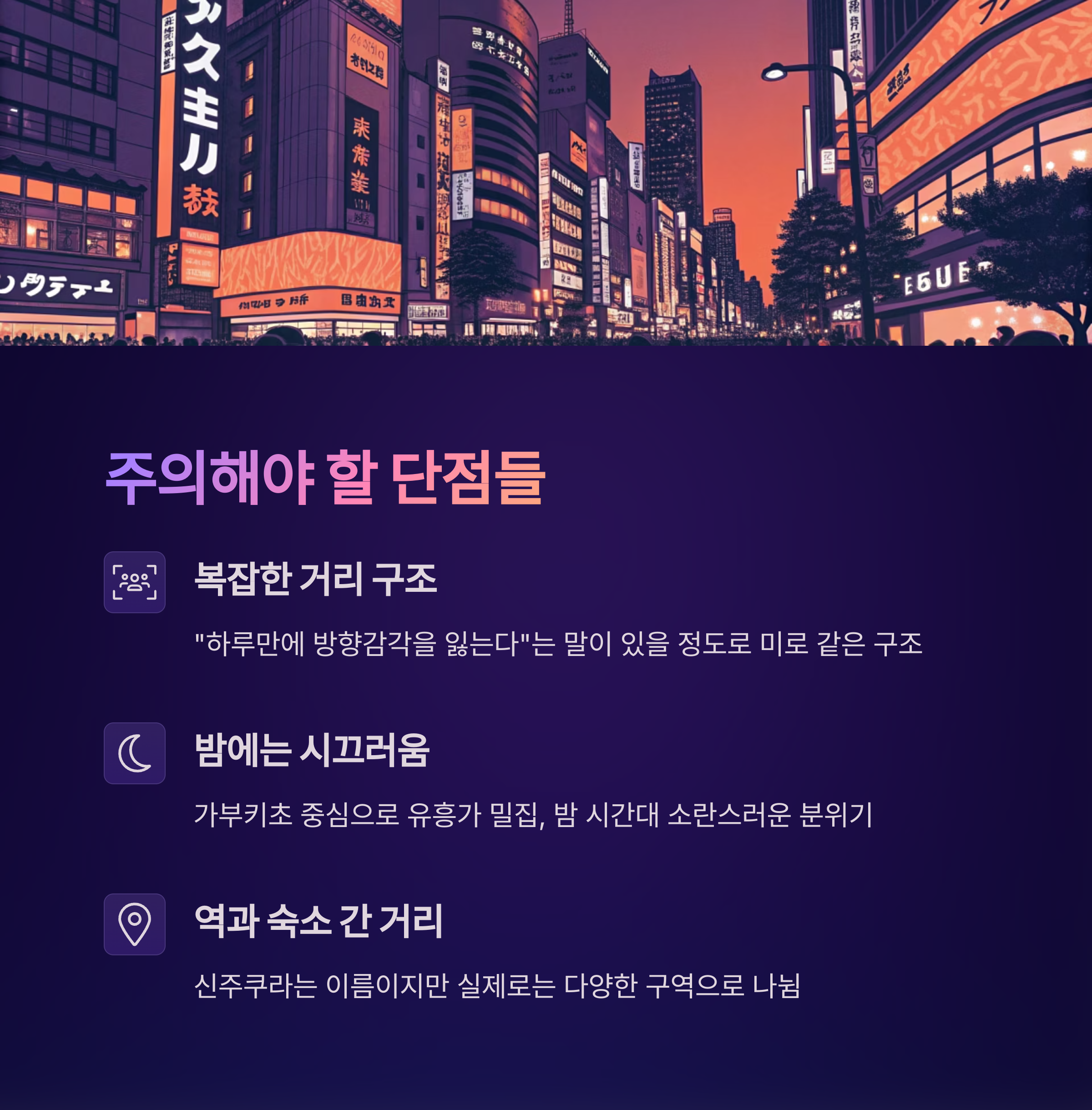 신주쿠는 확실한 장점과 단점을 모두 갖춘 지역입니다.