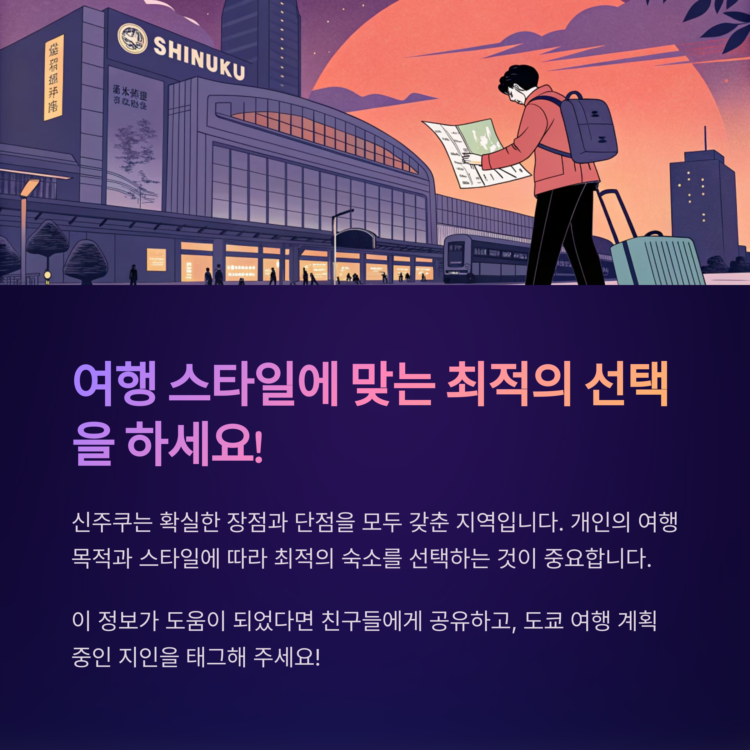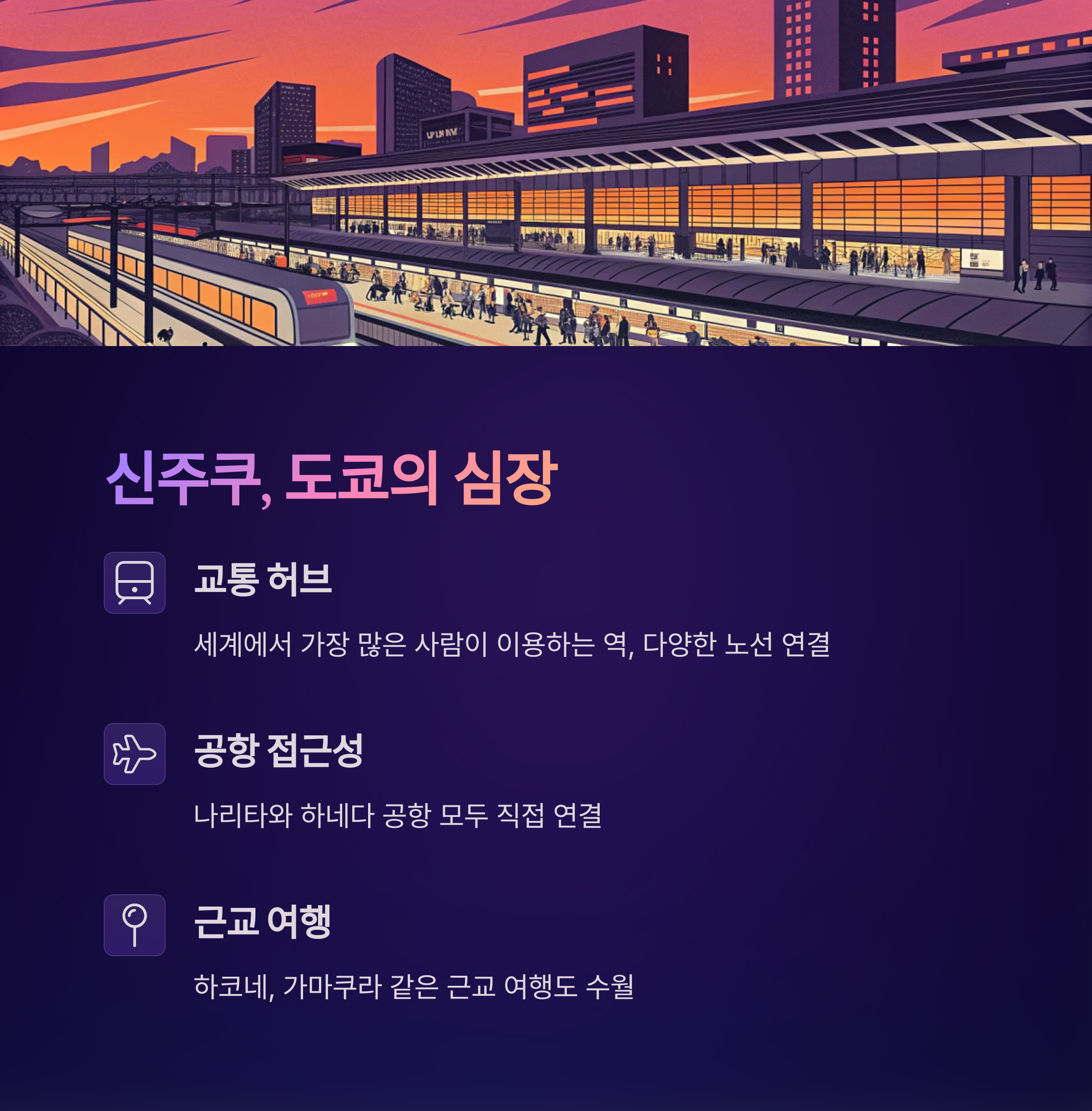 신주쿠는 도쿄의 교통과 상업의 중심지로, 다양한 숙소 옵션과