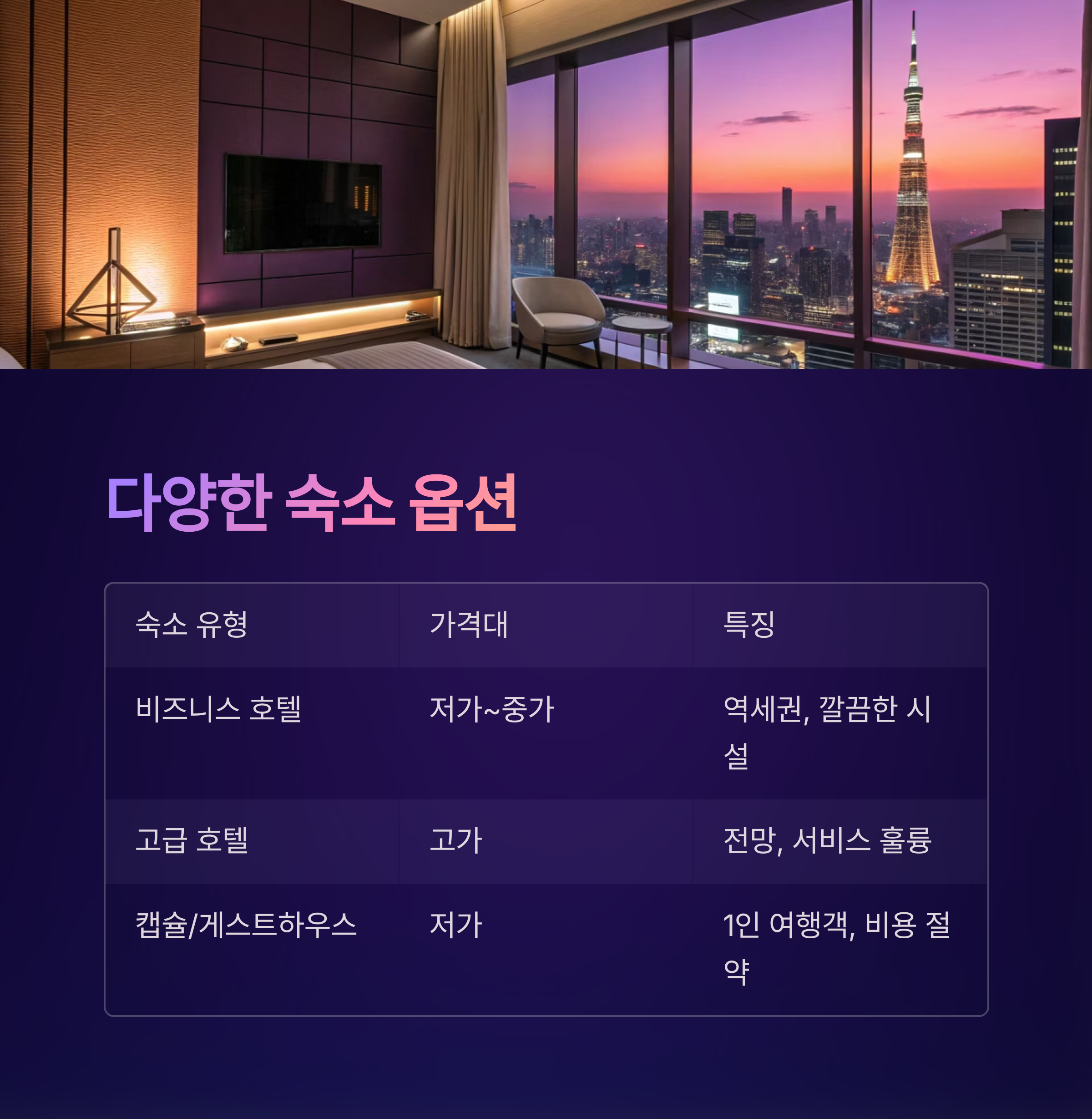 | 캡슐/게스트하우스 | 저가 | 1인 여행객, 숙박비 절약 목적 |
