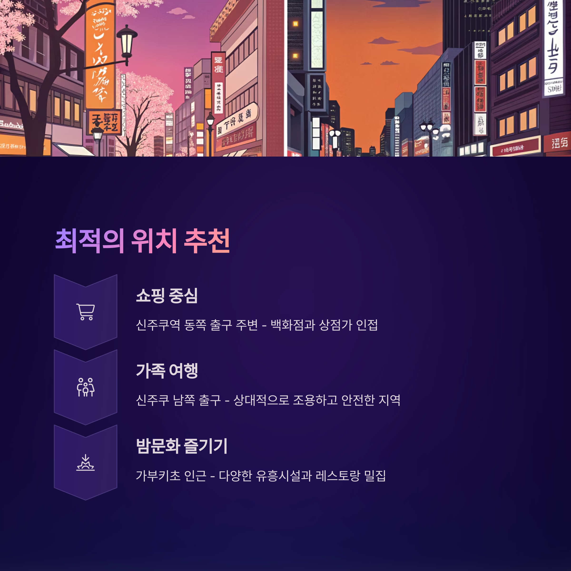 안전과 숙면이 중요한 여행객은 남쪽 지역(신주쿠 남쪽 출구 주변) 숙소를 고려하는 것이 현명합니다.
