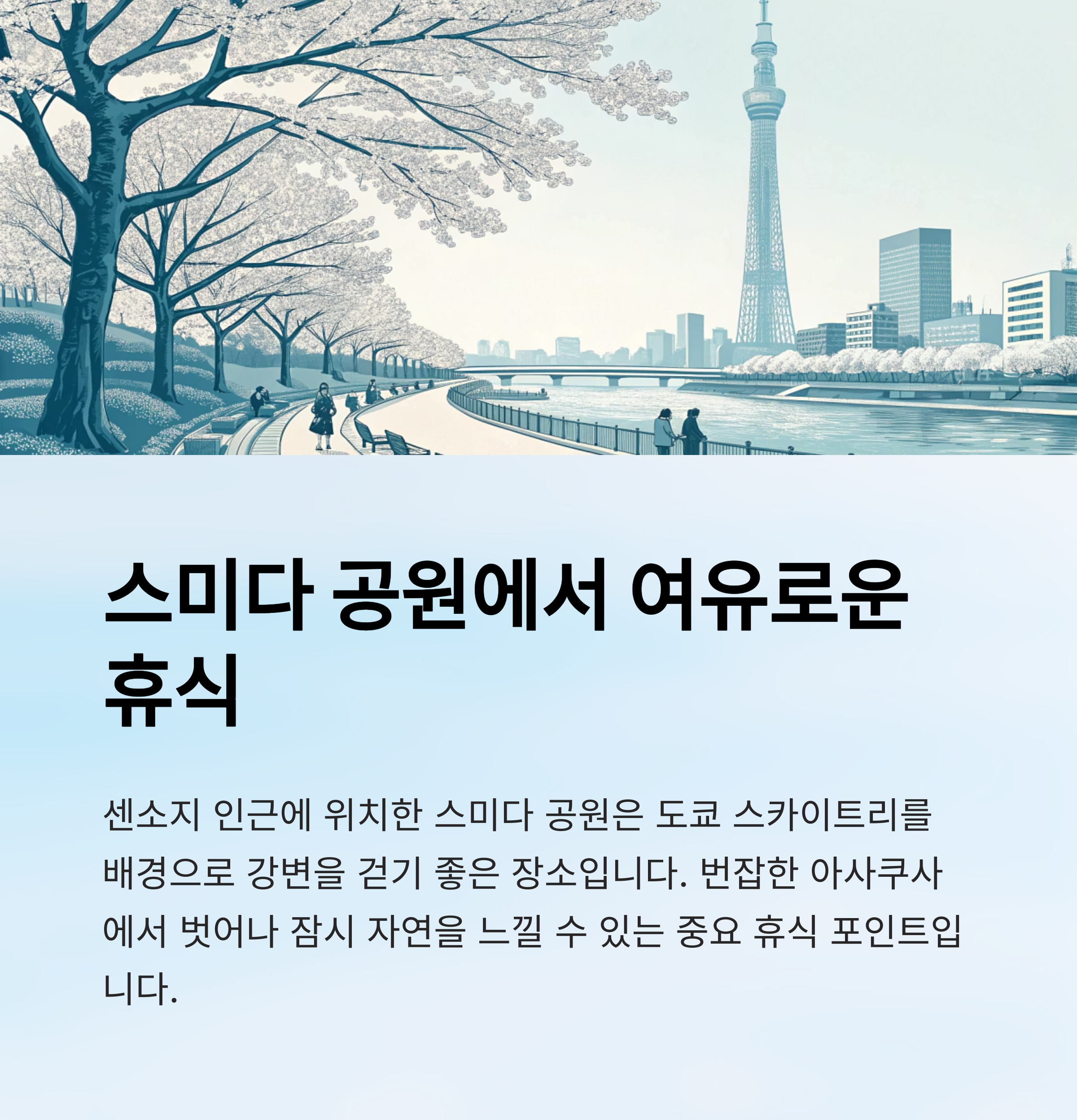 | 오전 10시 | 스미다 공원 | 벚꽃길 산책, 휴식 |