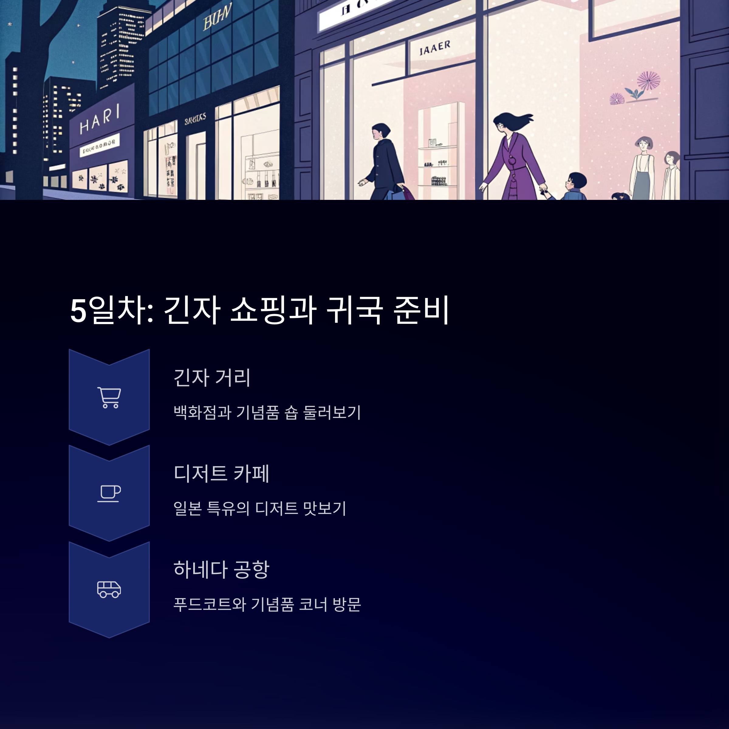 | 5일차 | 긴자, 하네다 | 쇼핑, 귀국 준비 |