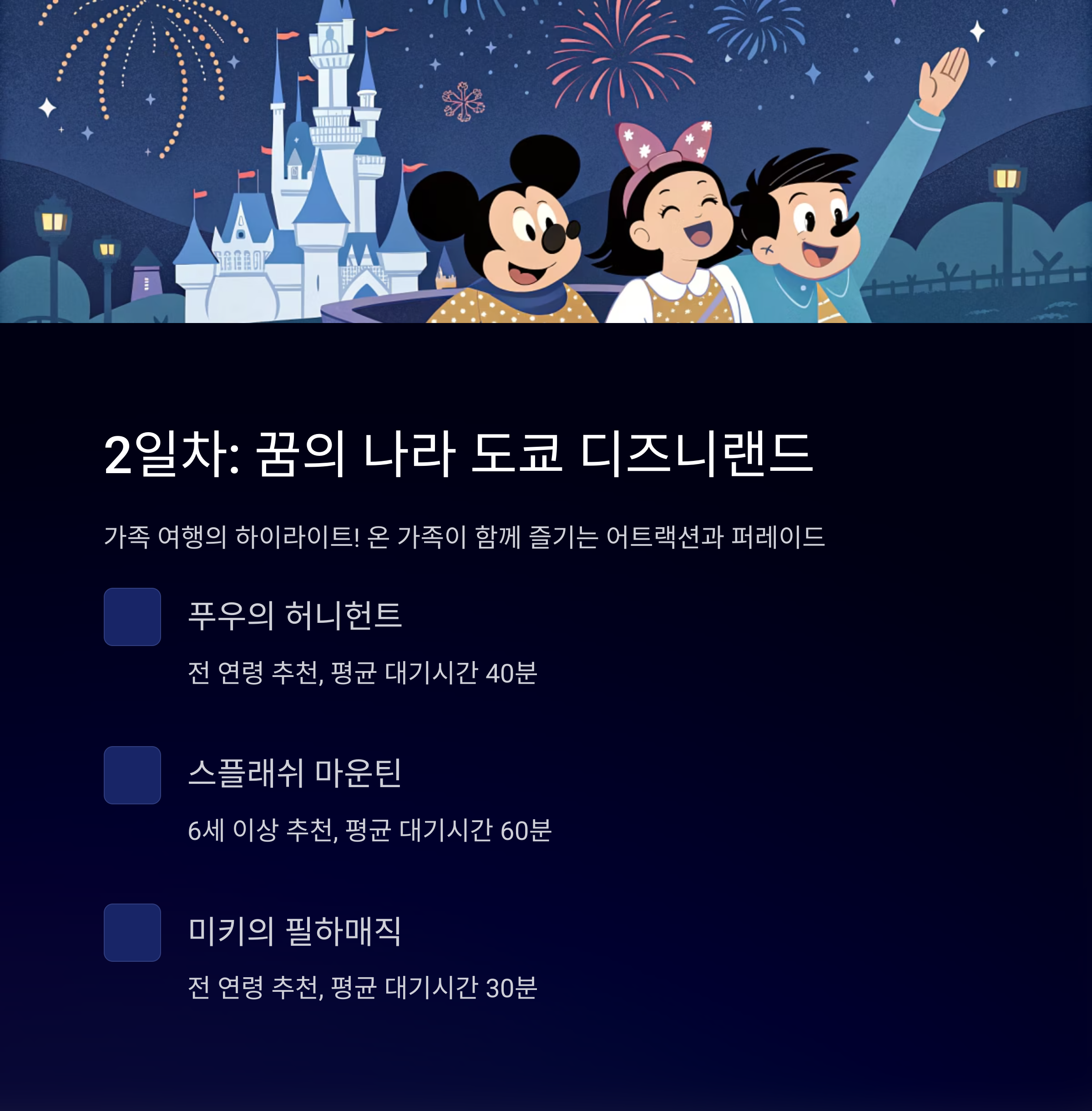| 2일차 | 마이하마 | 도쿄 디즈니랜드 즐기기 |