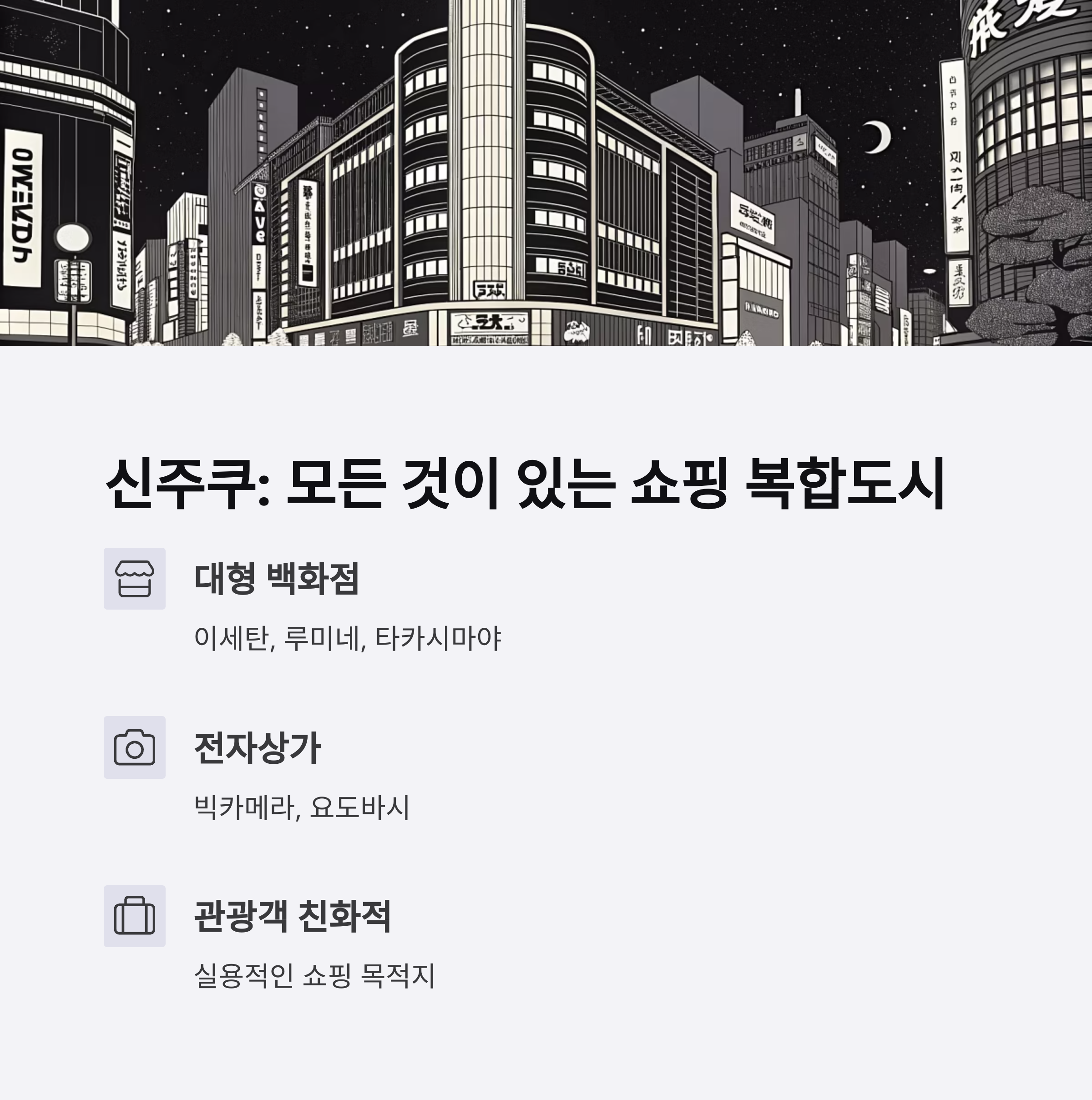| 신주쿠 | 종합 쇼핑, 실용적 | 관광객, 다양한 물품 찾는 이 |