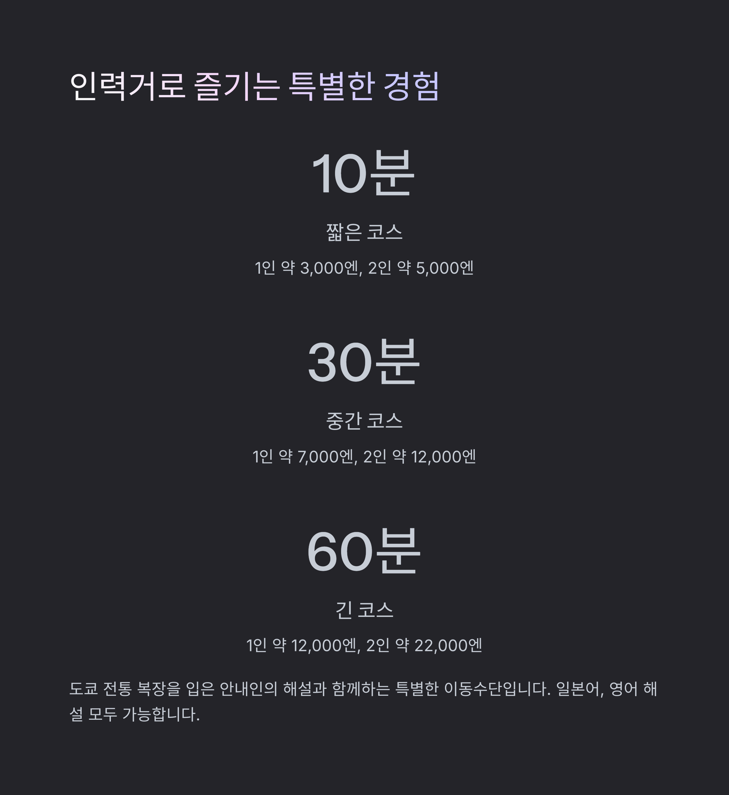 도쿄 전통 복장을 입은 안내인의 해설과 함께 하는 이동수단입니다.