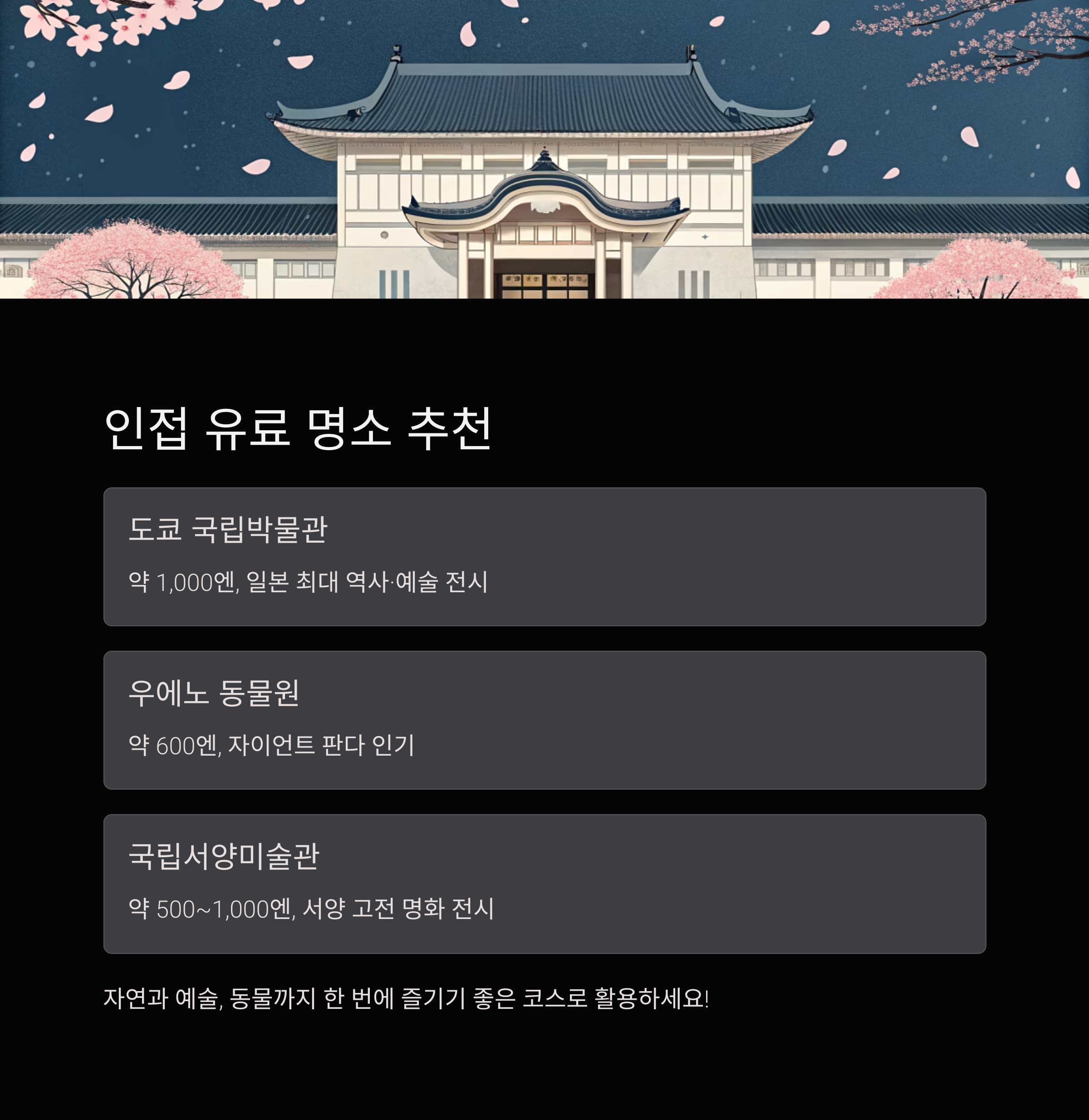 | 도쿄 국립박물관 | 약 1,000엔 | 일본 최대 역사·예술 전시 |