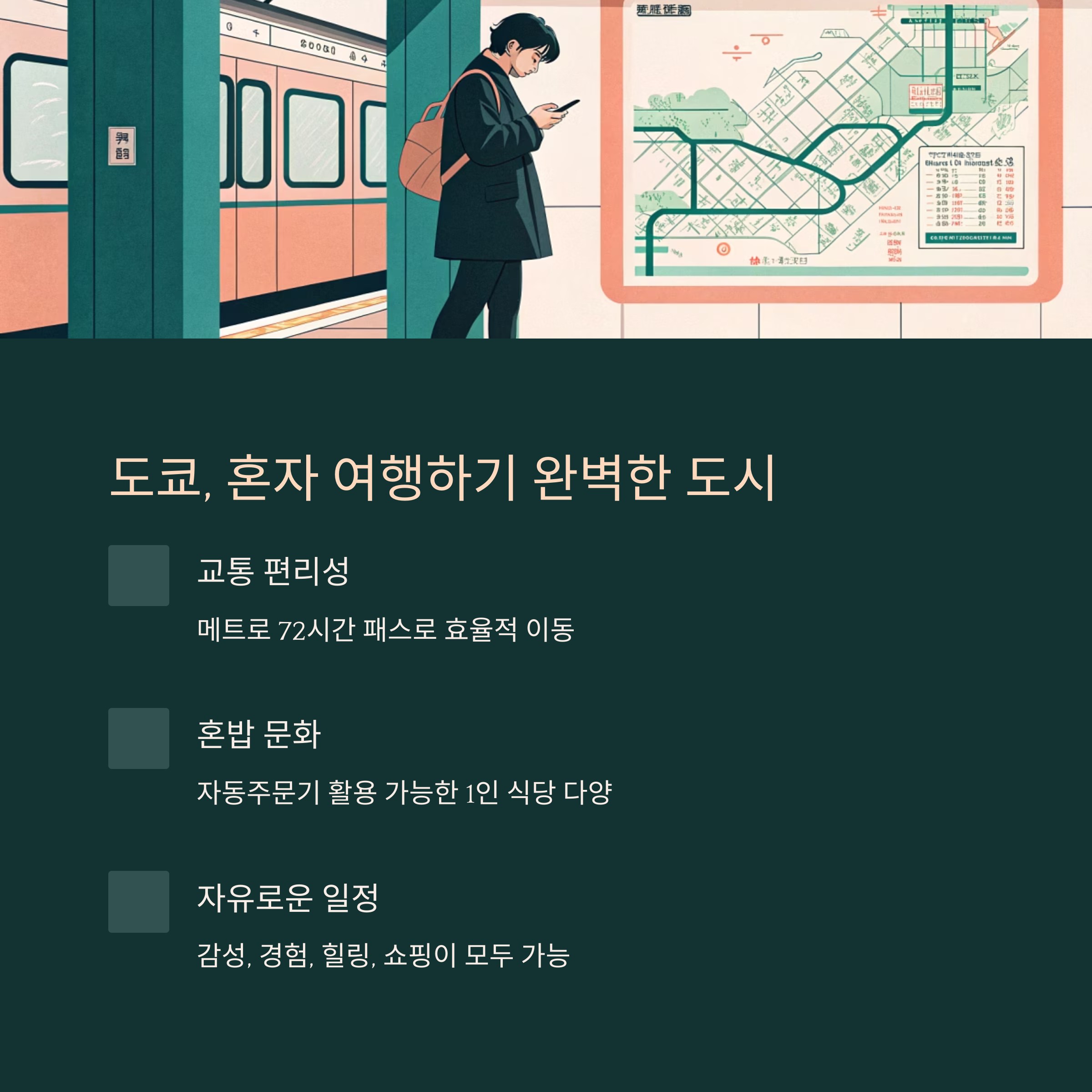 도쿄는 교통이 편리하고 혼밥, 혼카페, 혼산책 문화가 자리 잡아