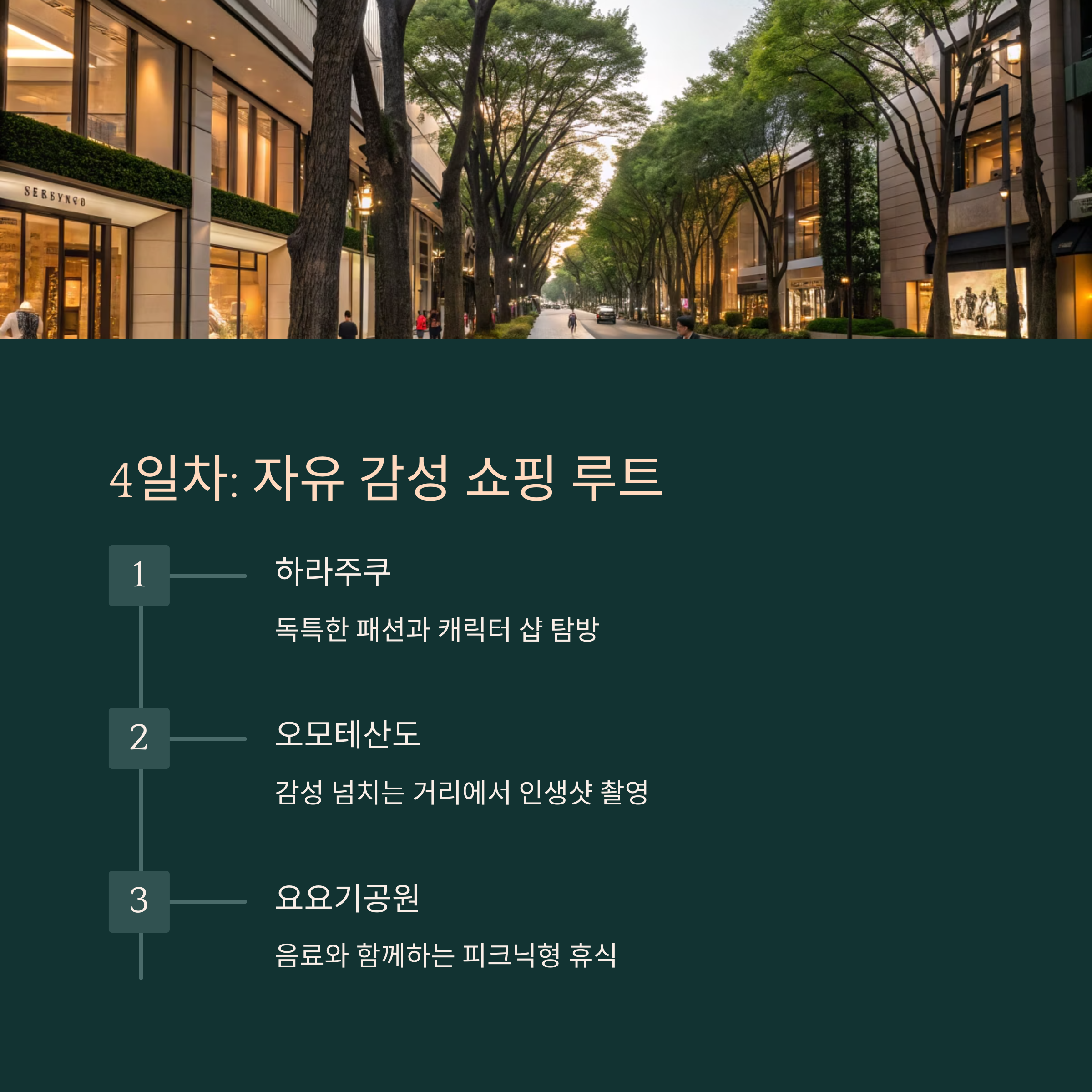 하라주쿠 골목길 구경 → 오모테산도 감성 사진 → 요요기공원 산책 → 도큐 플라자 쇼핑