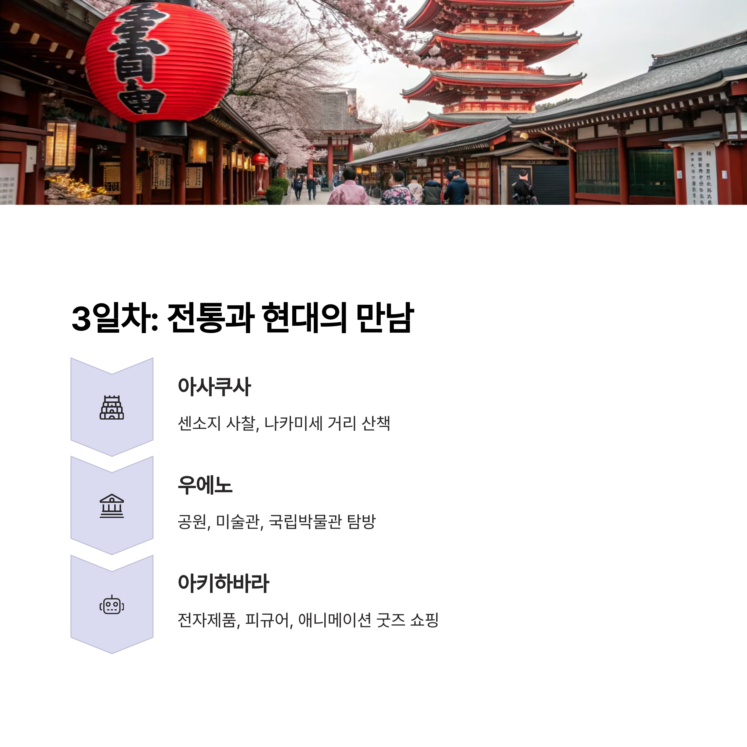 | 3일차 | 아사쿠사~우에노 | 센소지, 나카미세, 아키하바라 |