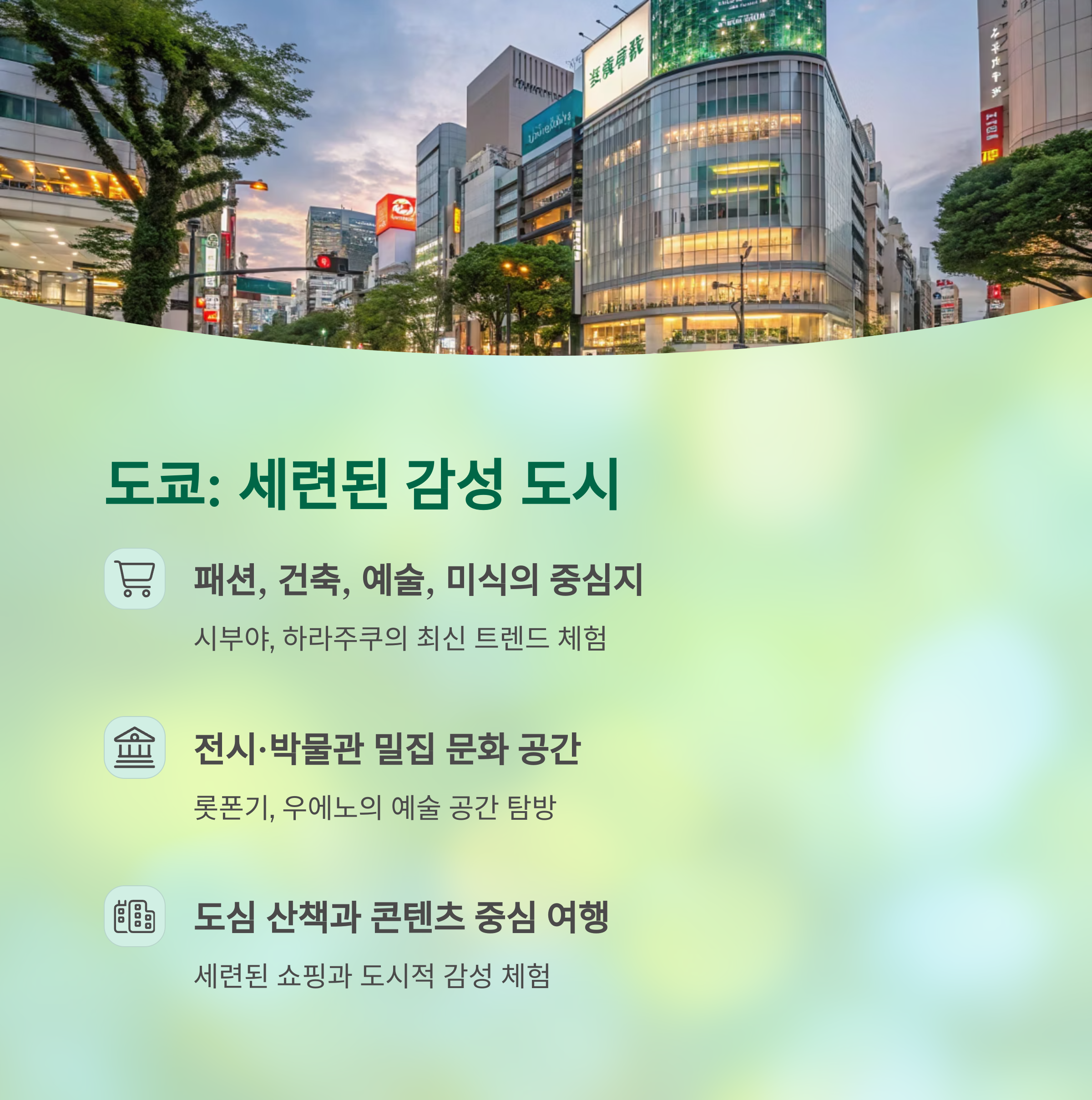 도쿄 트렌드·문화 중심 전시, 쇼핑, 세련된 도시 예술·패션 감각 추구자