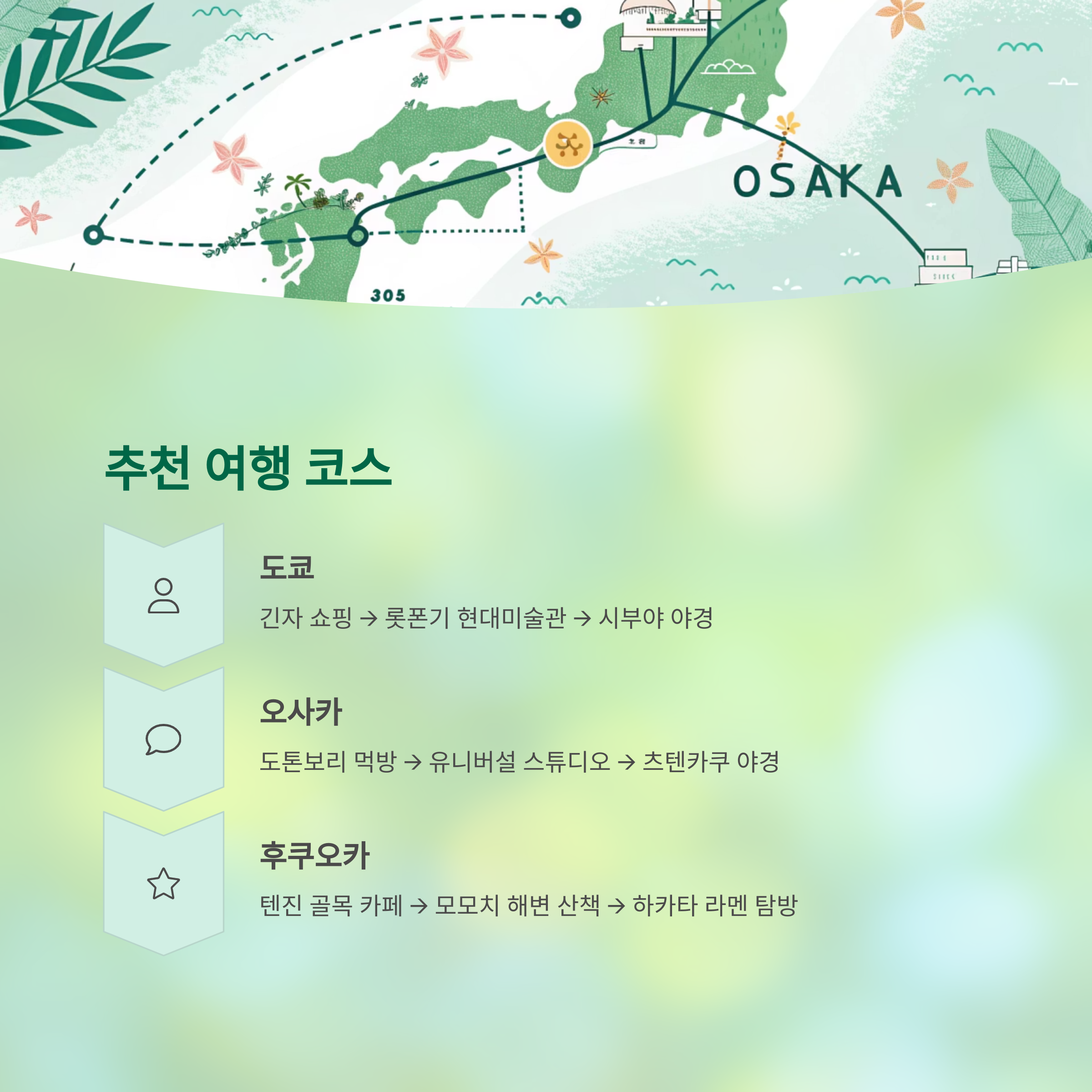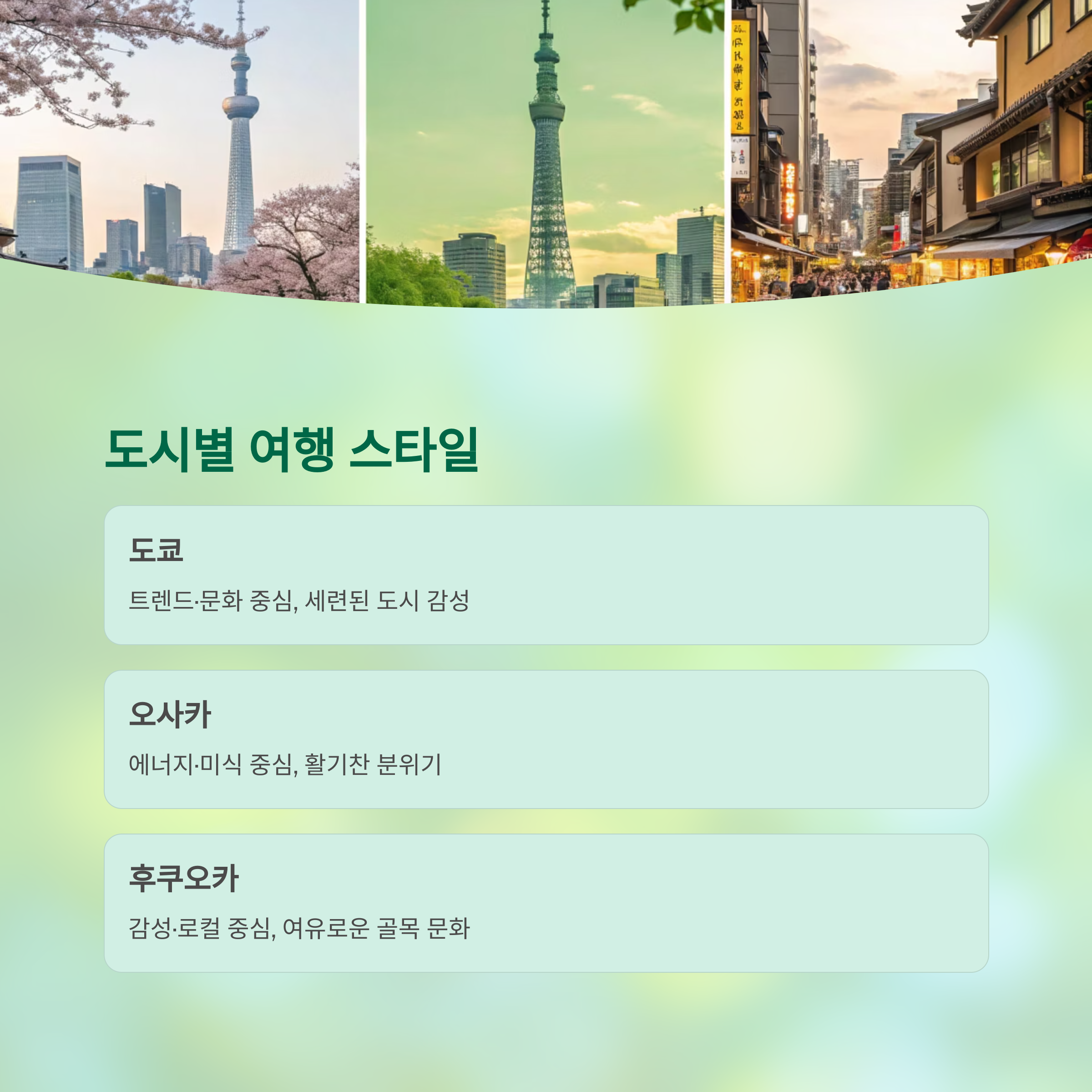 | 후쿠오카 | 감성·로컬 중심 | 골목, 카페, 로컬시장 | 조용하고 감성적인 여행자 |