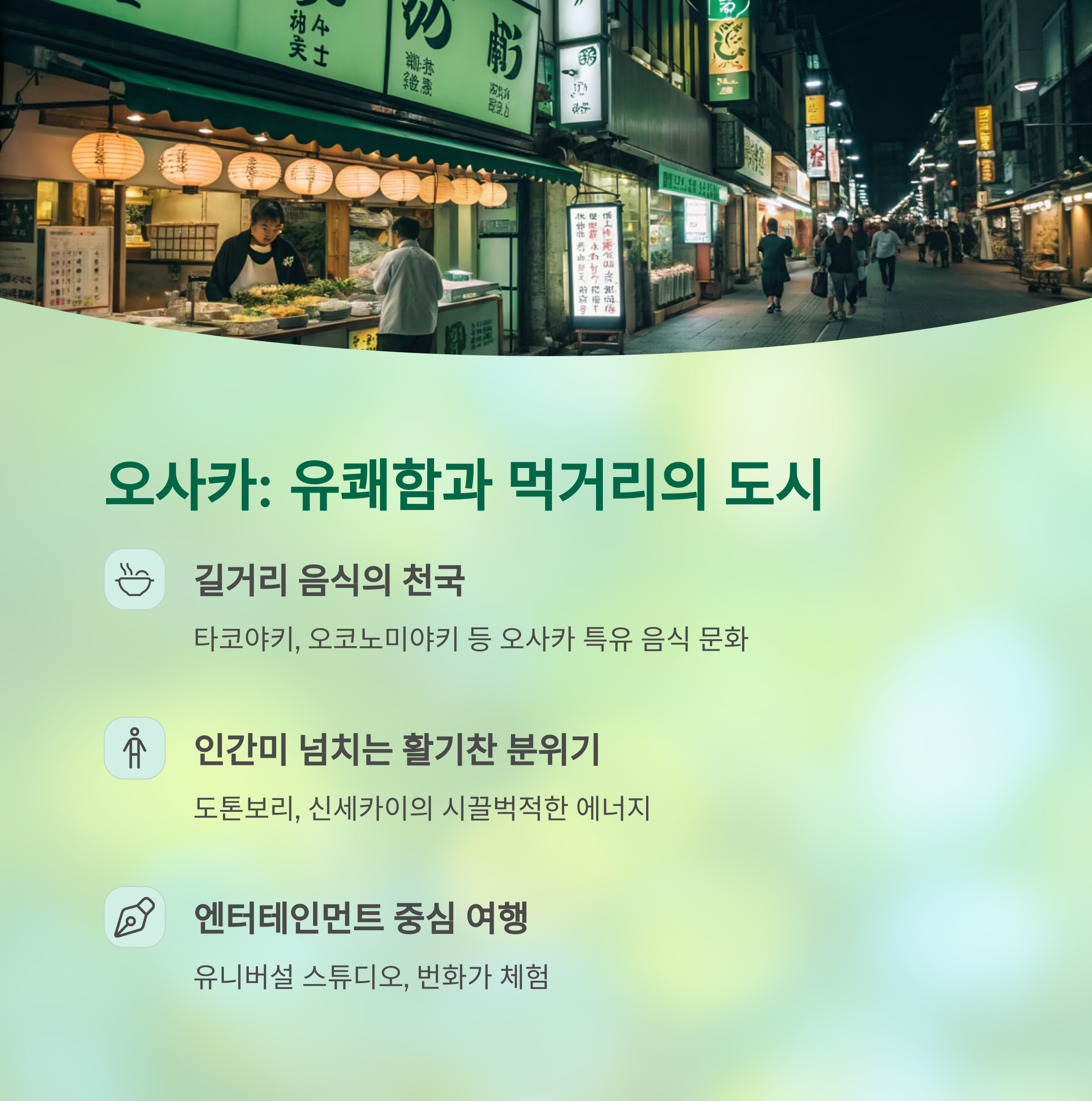 | 오사카 | 에너지·미식 중심 | 길거리 음식, 엔터테인먼트 | 활기찬 여행 좋아하는 사람 |
