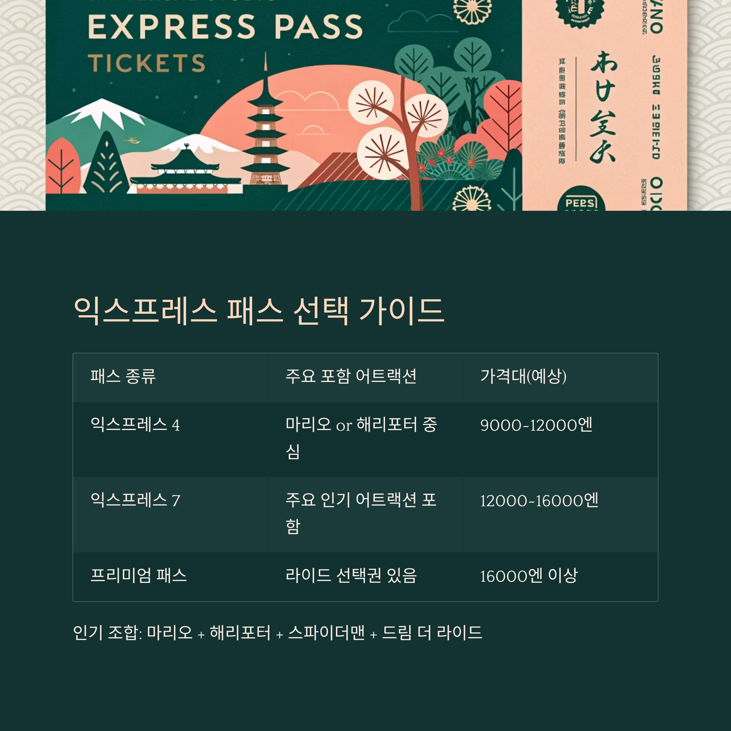 | 익스프레스 7 | 주요 인기 어트랙션 포함 | 12000~16000엔 |
