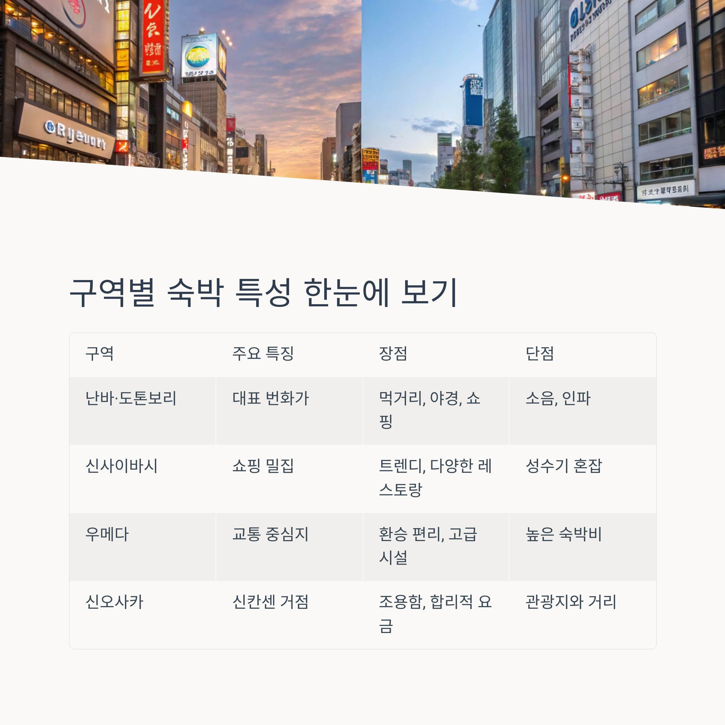 | 우메다 | 교통 중심지 | 환승 편리, 고급 숙소 많음 | 숙박비 높음 |