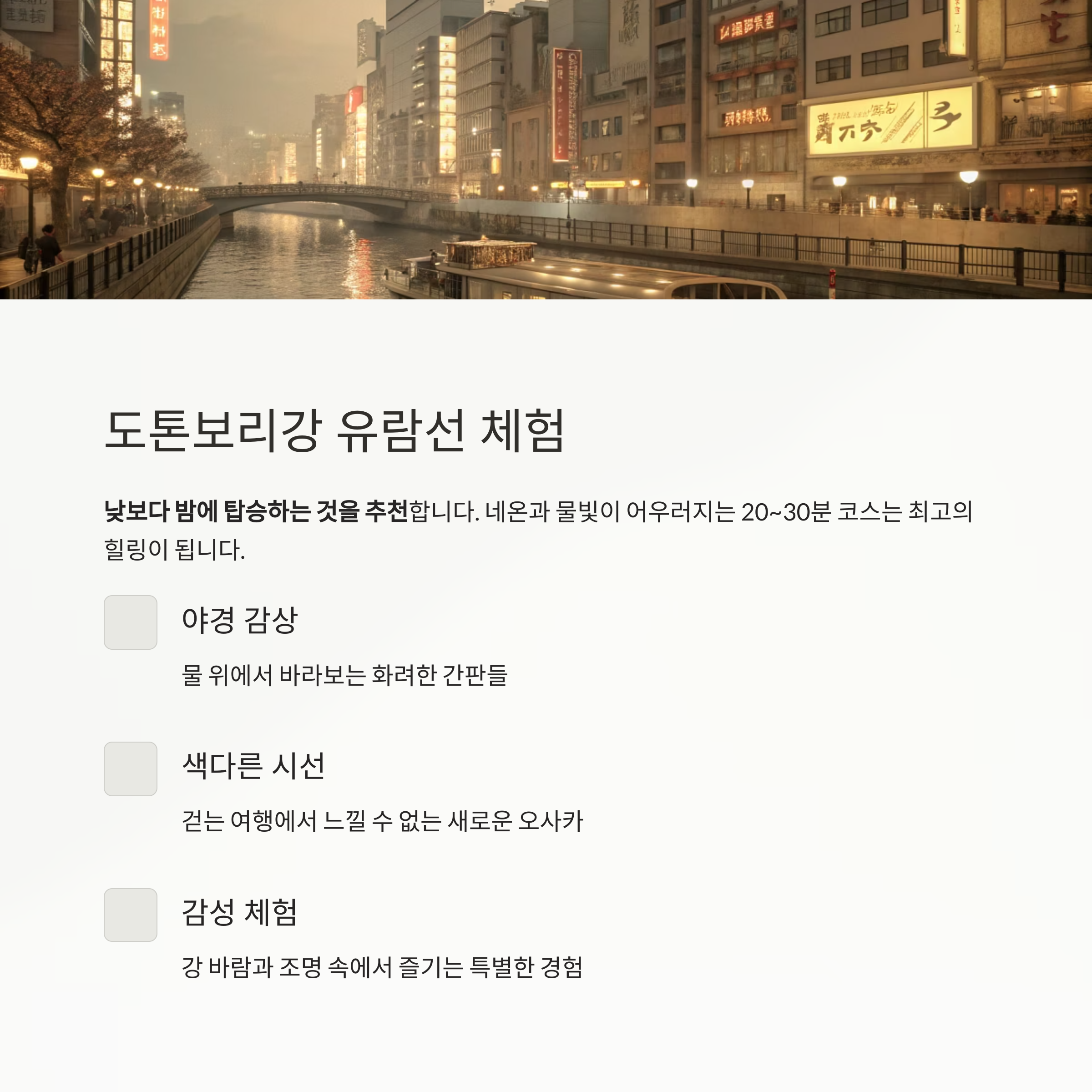 | 감성 체험 | 도톤보리강 유람선, 야경 투어 |