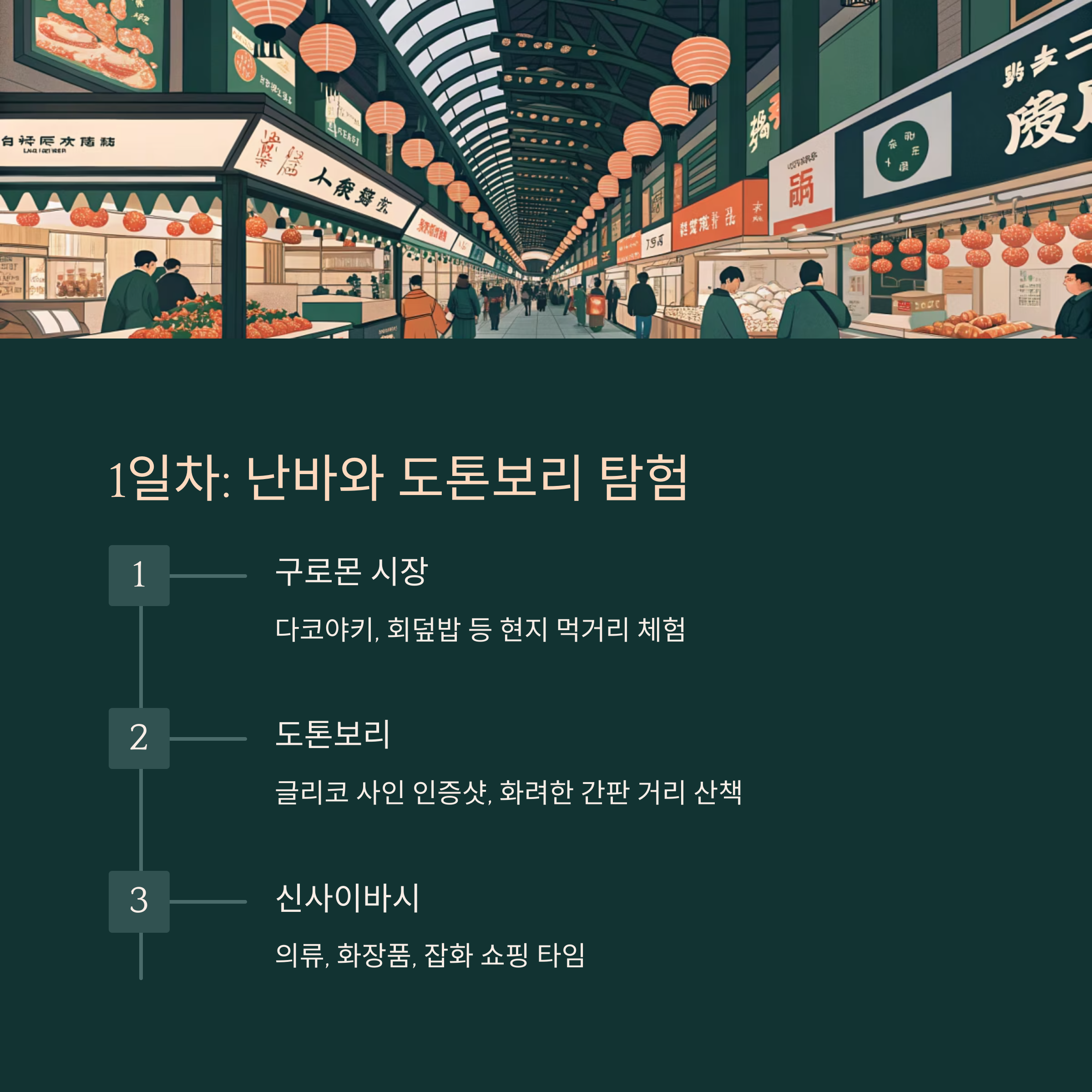 도착 후 가장 먼저 향할 곳은 오사카의 활력 넘치는 중심, 난바입니다.