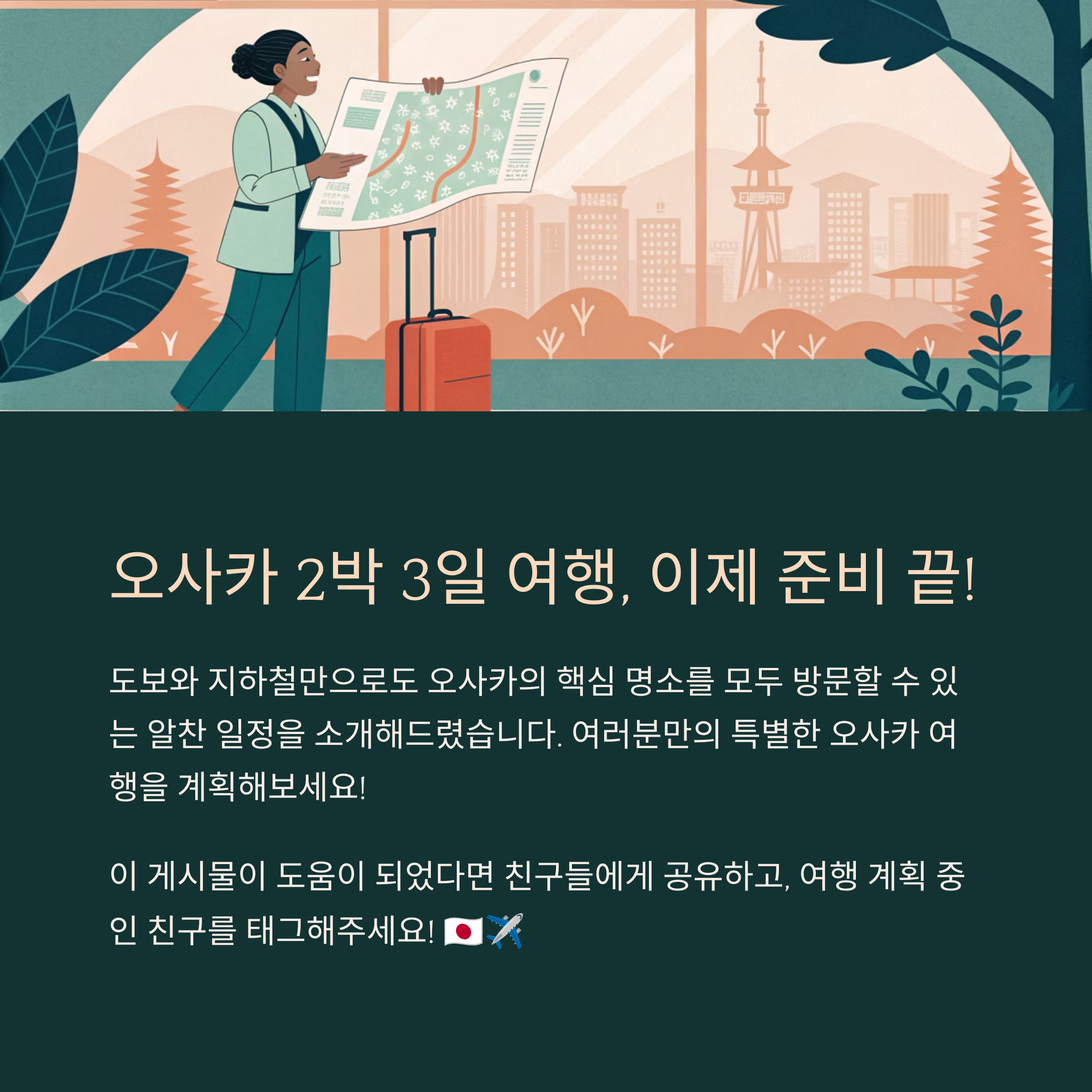 오사카는 주요 명소가 지하철과 도보로 연결돼 있어 2박 3일만으로도 핵심 명소를 모두 방문할 수 있는 도시입니다.