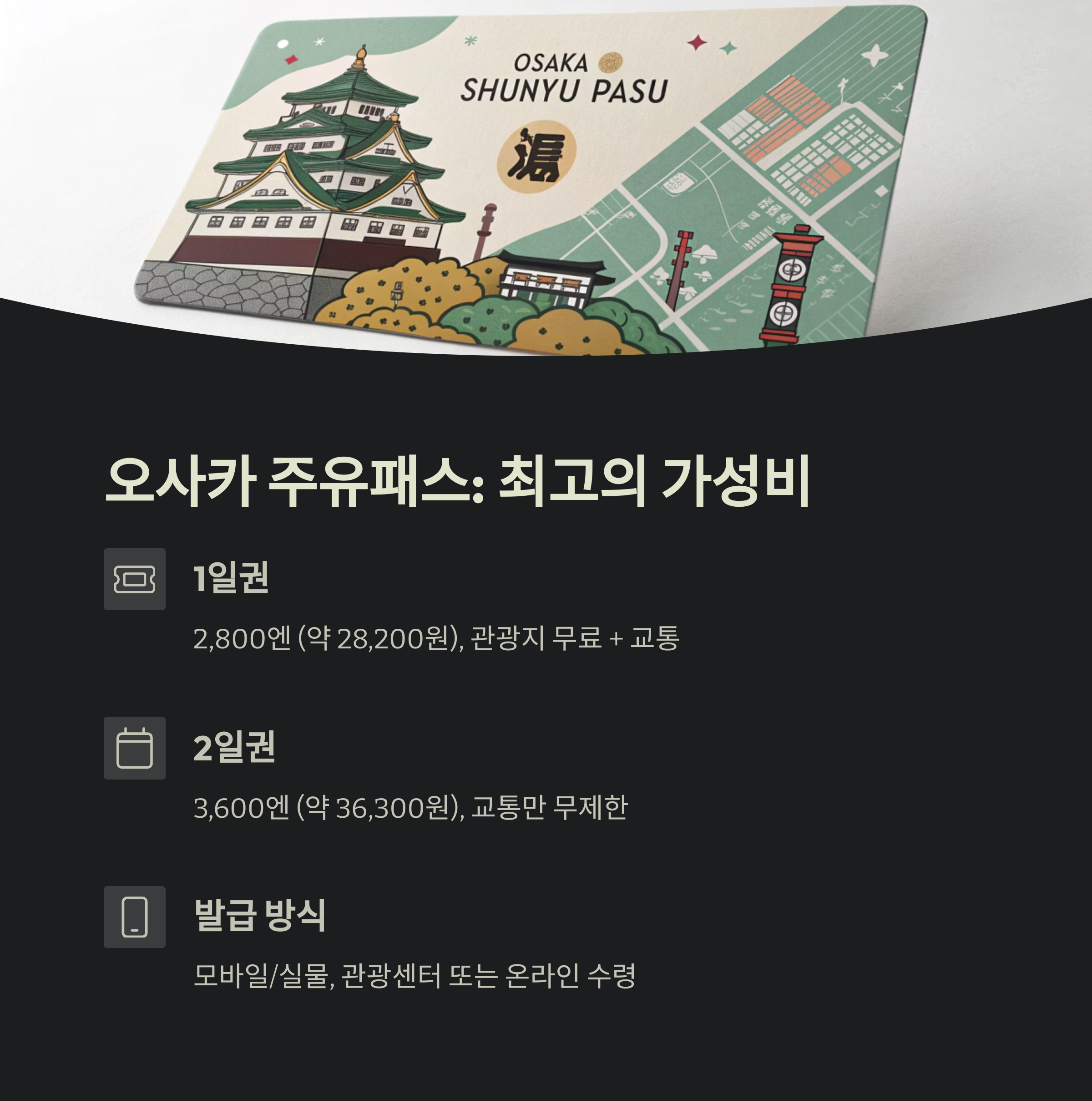 | 발급 방식 | 모바일/실물 | 각종 관광센터 또는 온라인 수령 |