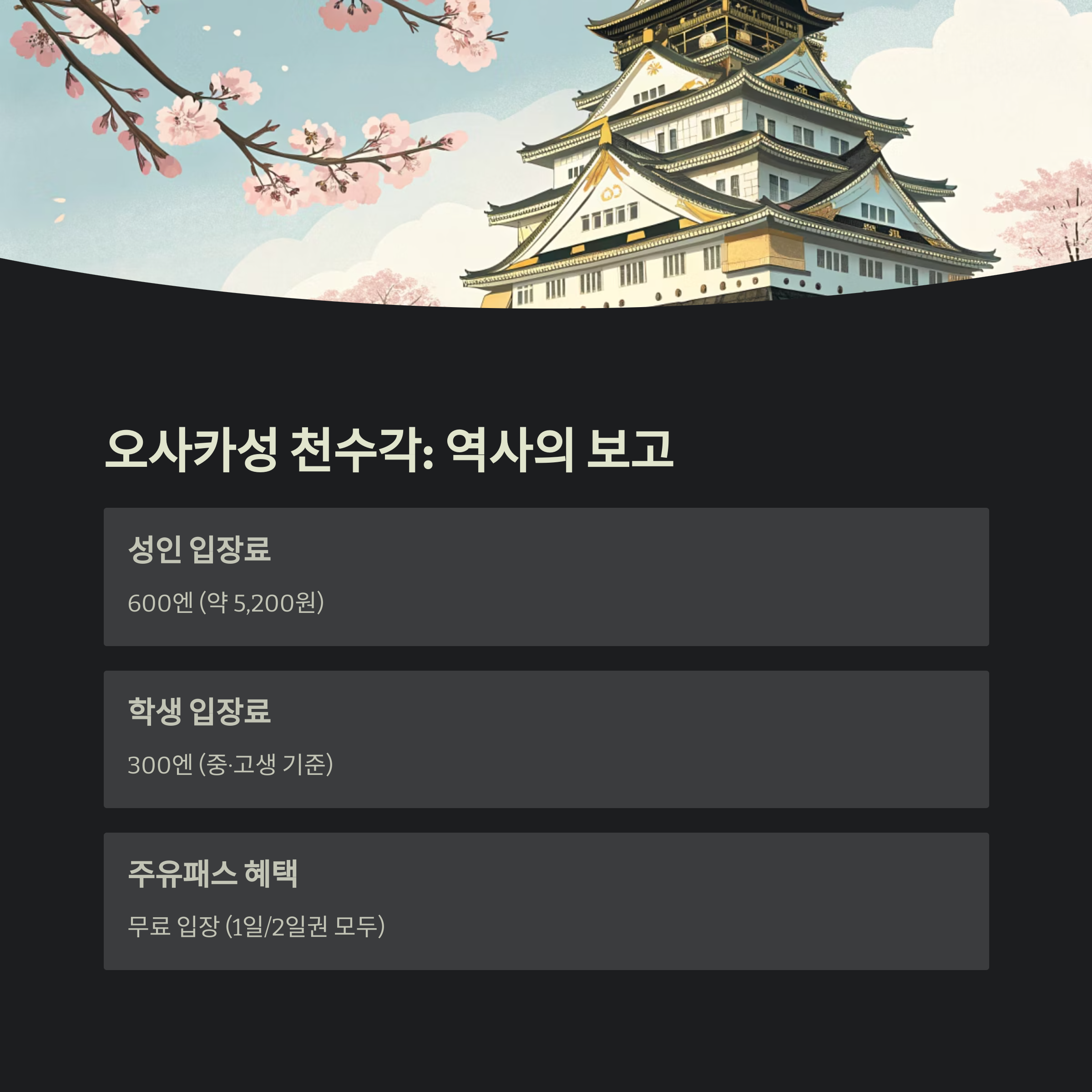 | 오사카성 천수각 | 600엔 | 적용 가능 | 문화유산 |