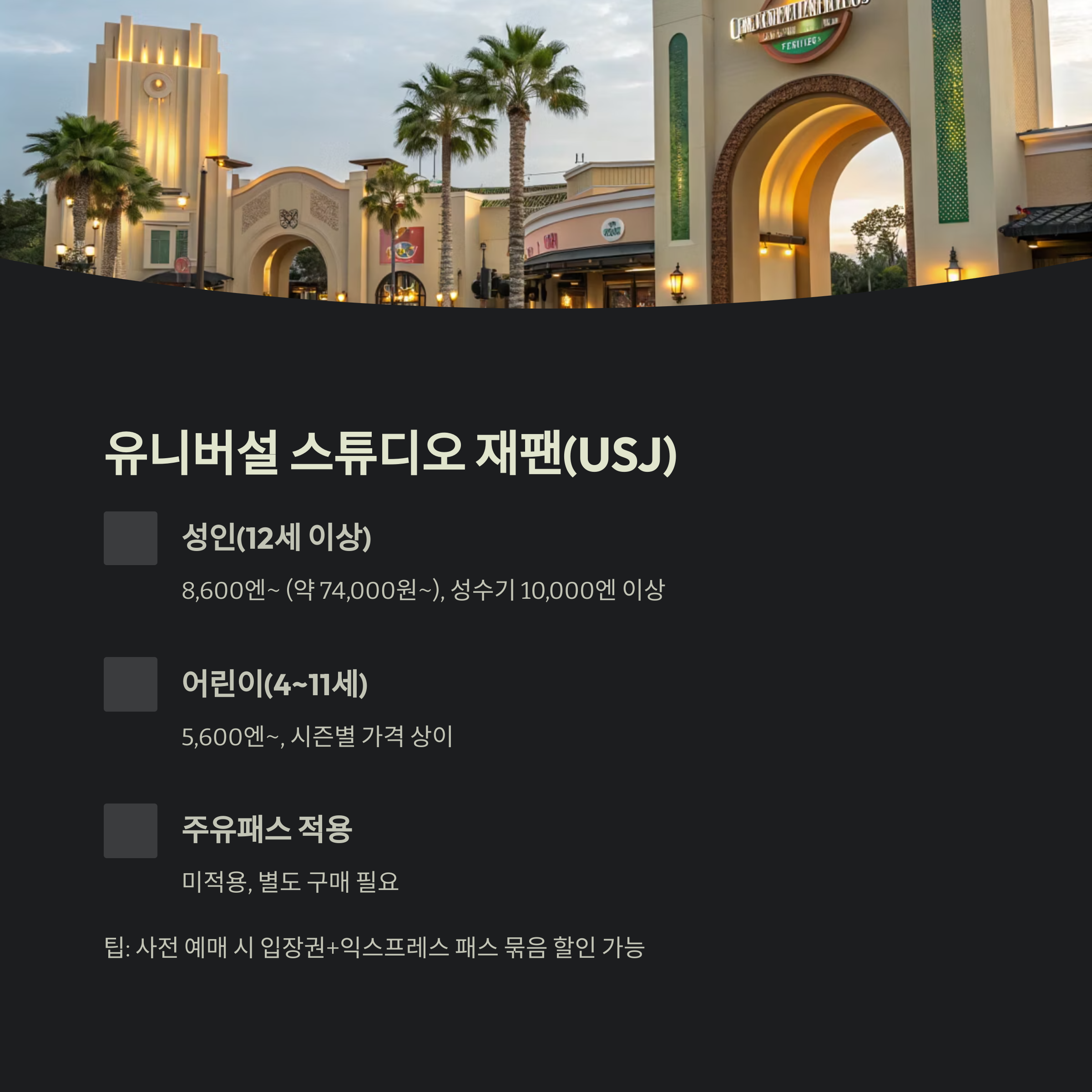 | USJ | 8,600엔~ | 미적용 | 사전 예매 필수 |