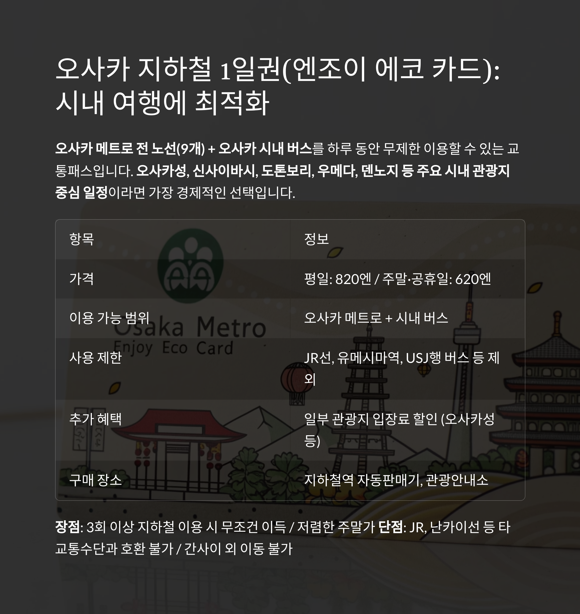 | 이용 가능 범위 | 오사카 메트로 + 시내 버스 |
