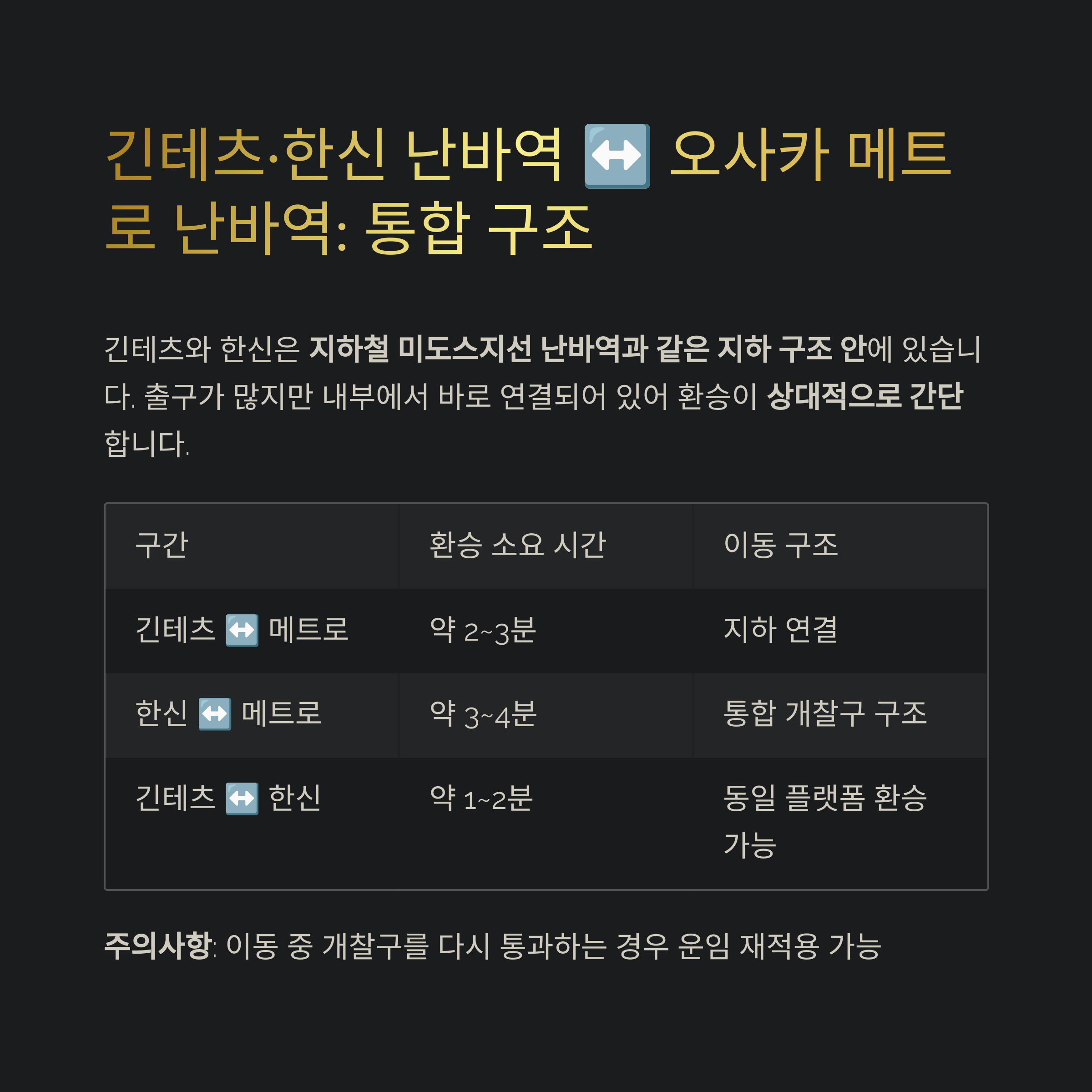 | 한신 ↔ 메트로 | 약 3~4분 | 통합 개찰구 구조 |