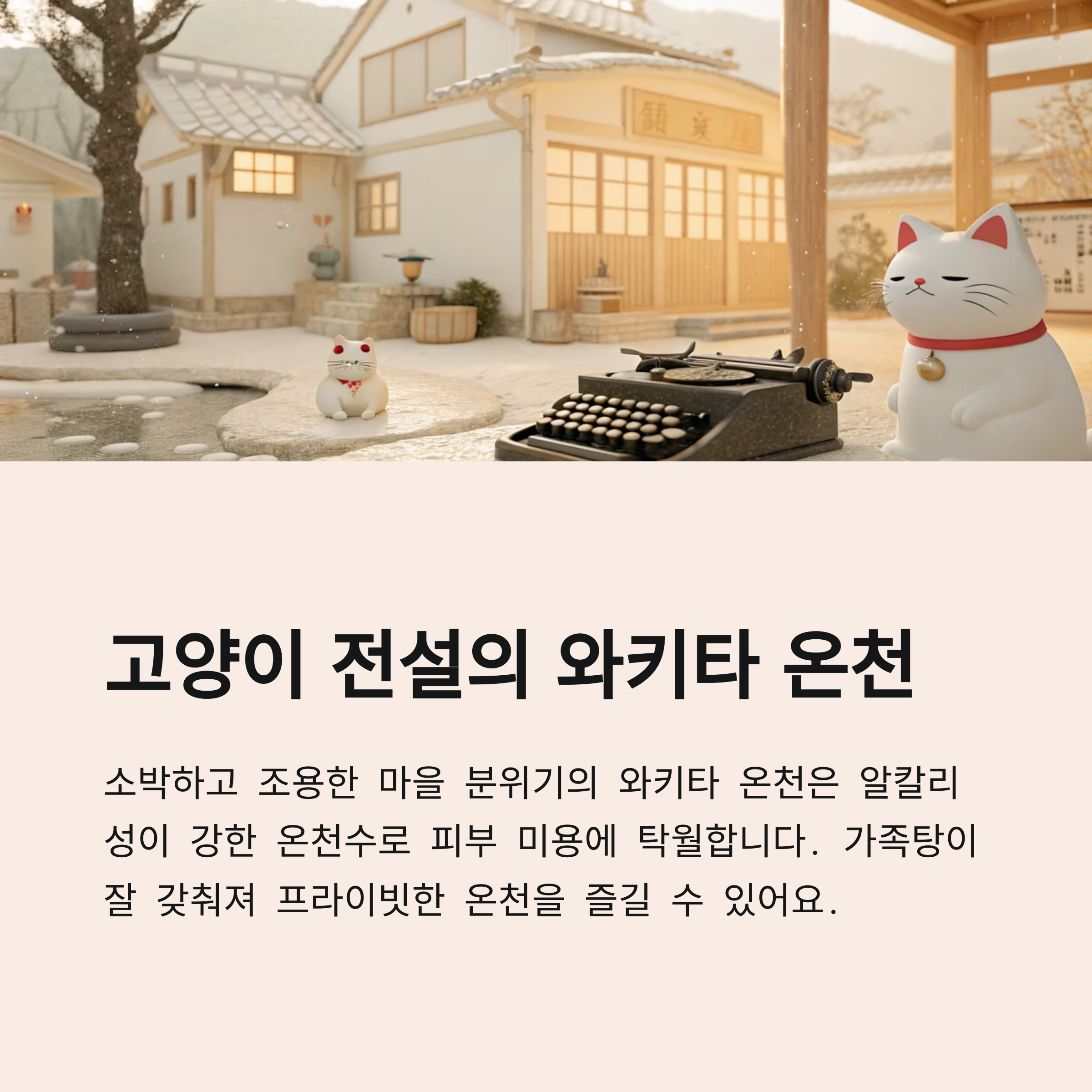와키타 온천은 소박하고 조용한 마을로, 고양이 전설로도 유명한 곳입니다. 알칼리성이 강한 온천수는 피부에 자극이 적고