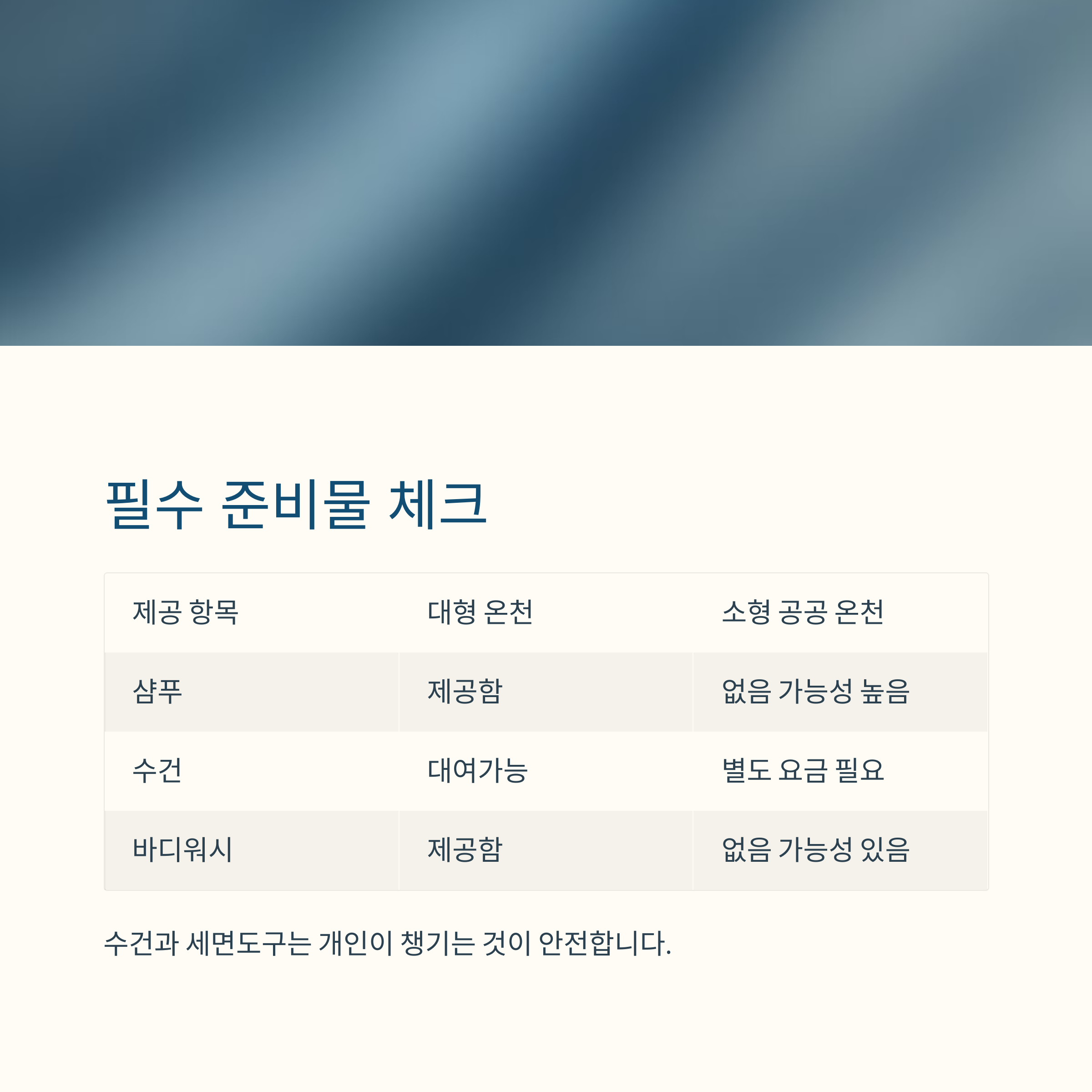 따라서 수건 한 장과 세면도구는 개인이 챙기는 것이 안전합니다.