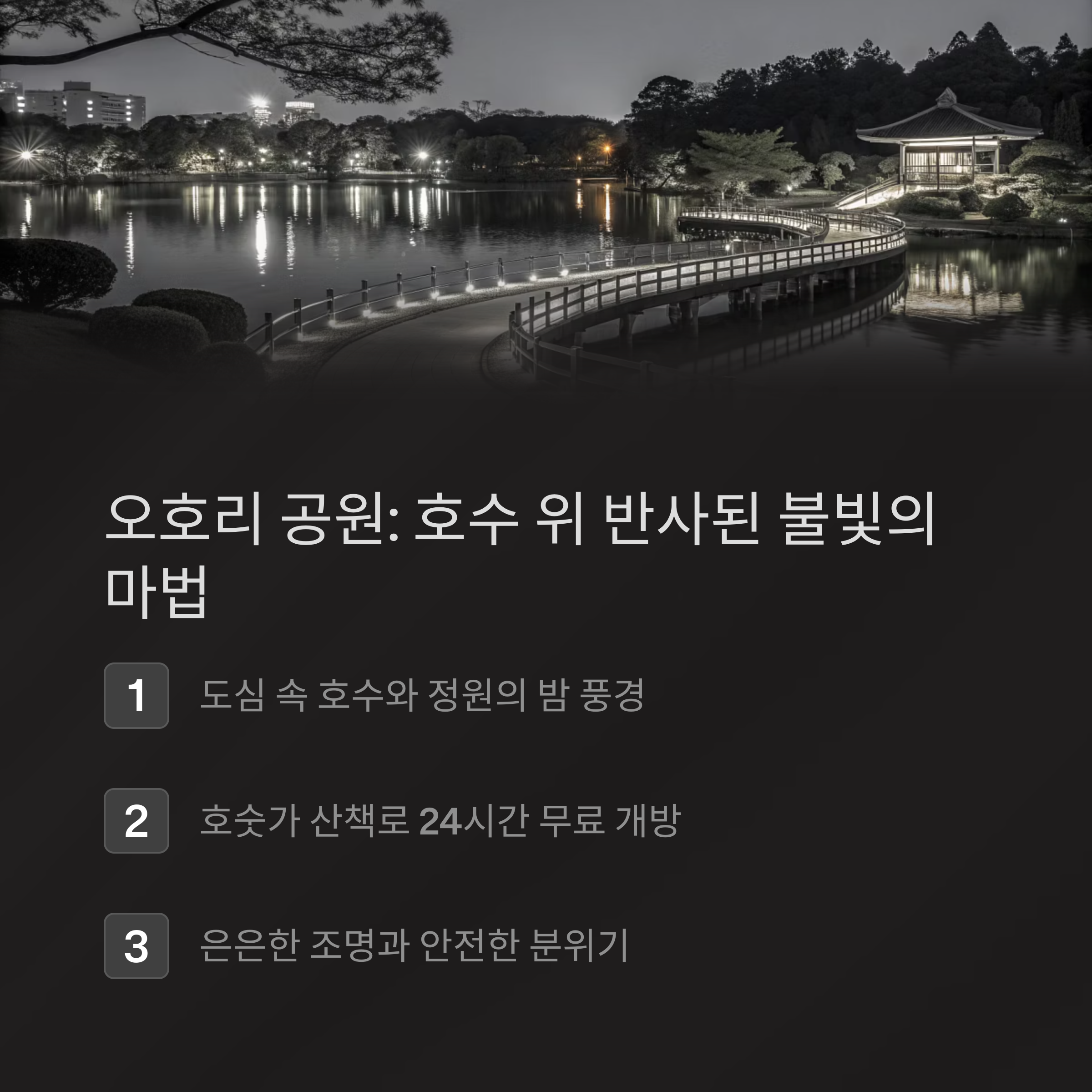 오호리 공원: 호수와 정원의 밤 풍경이 어우러진 도심 속 힐링