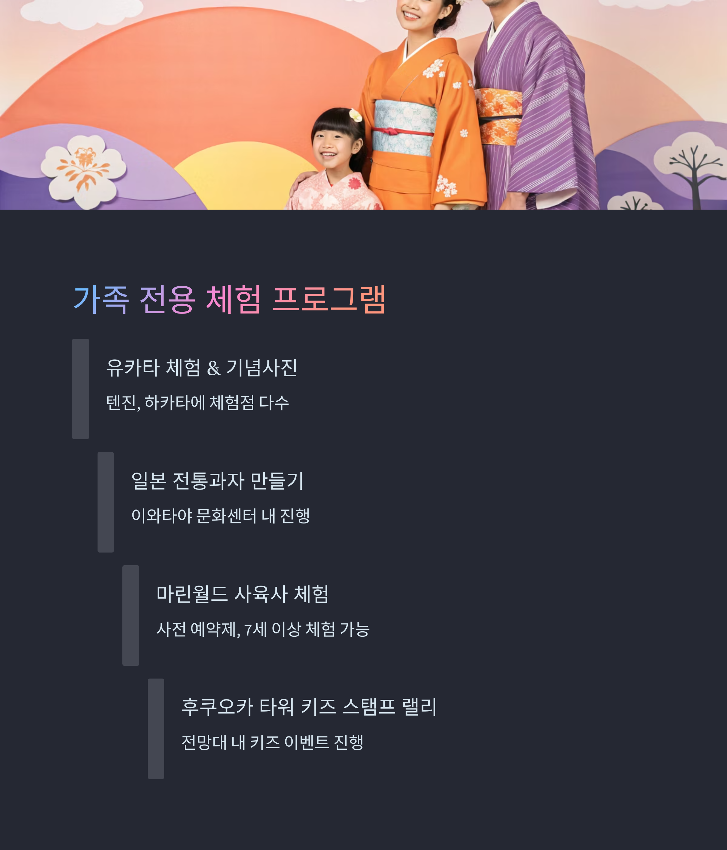 가족 여행자 전용 체험도 다양합니다. 일본 문화와 체험을 접목해 아이들의 추억을 만들어주는 시간으로 안성맞춤입니다.