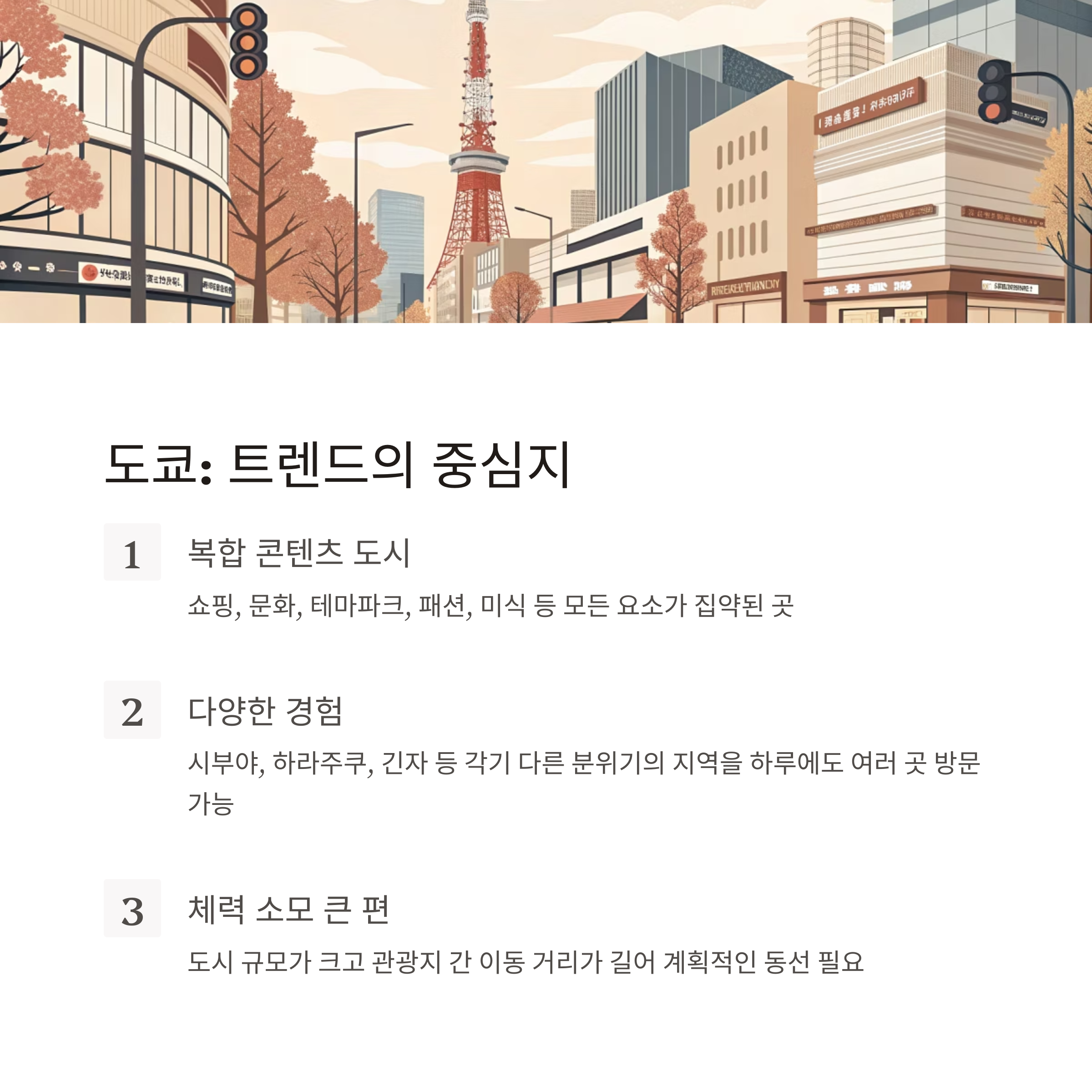 도쿄는 계획적으로 움직이면 다양한 경험이 가능하지만 동선 정리에 노력이 필요합니다.