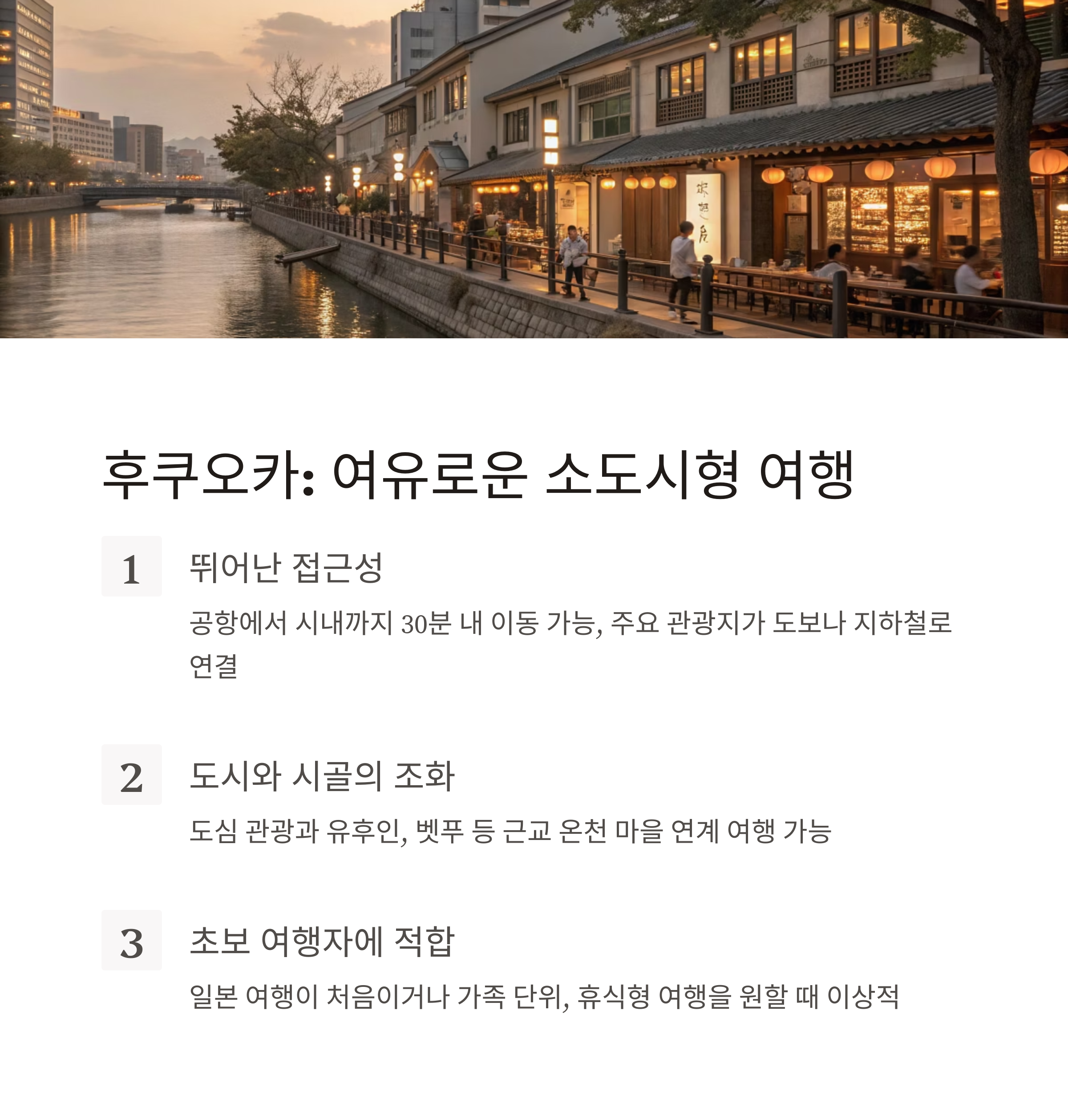 후쿠오카는 ‘조용하고 정돈된 여유로움’이 중심 테마입니다.