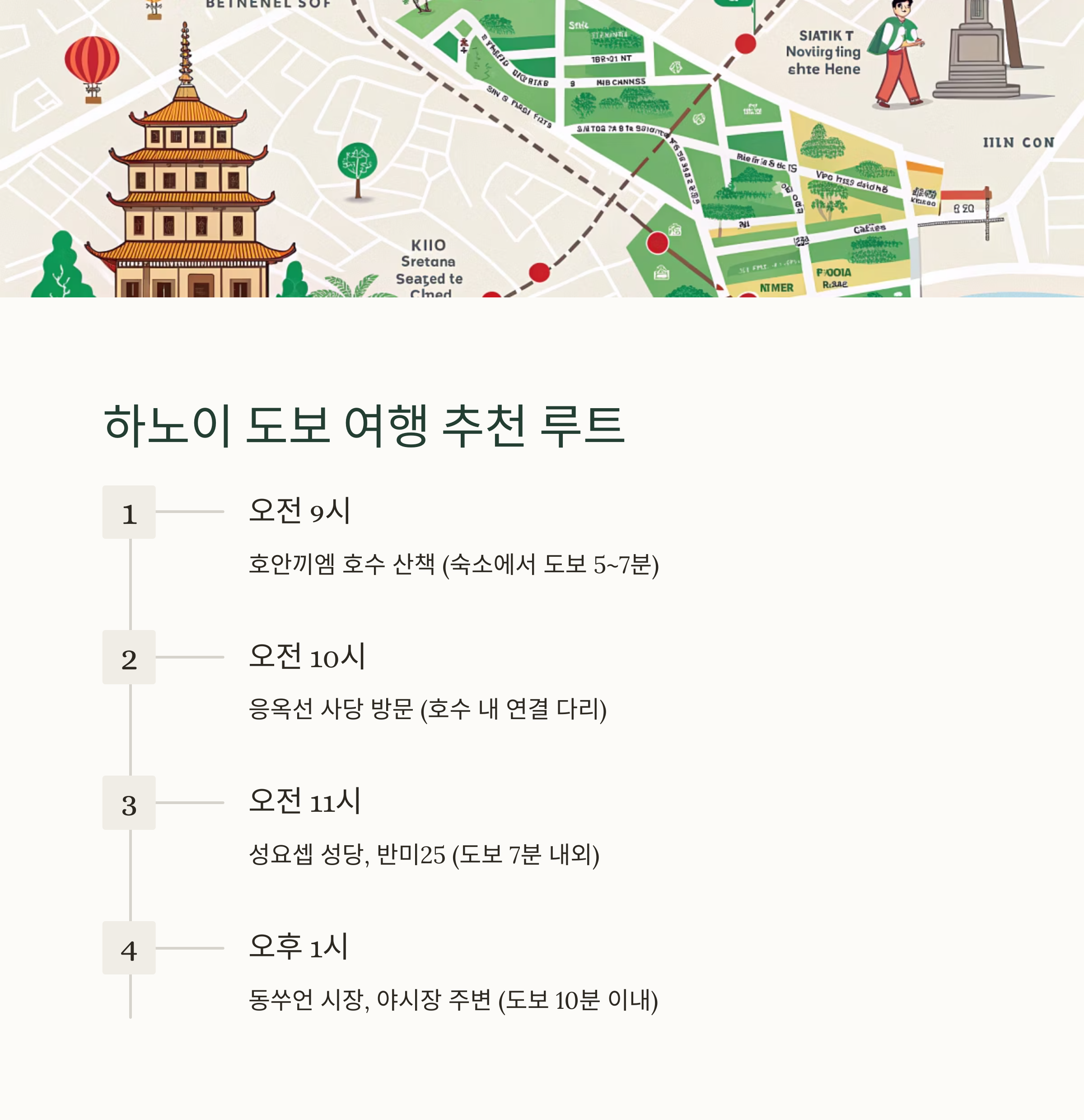 | 오전 9시 | 호안끼엠 호수 산책 | 숙소에서 도보 5~7분 |