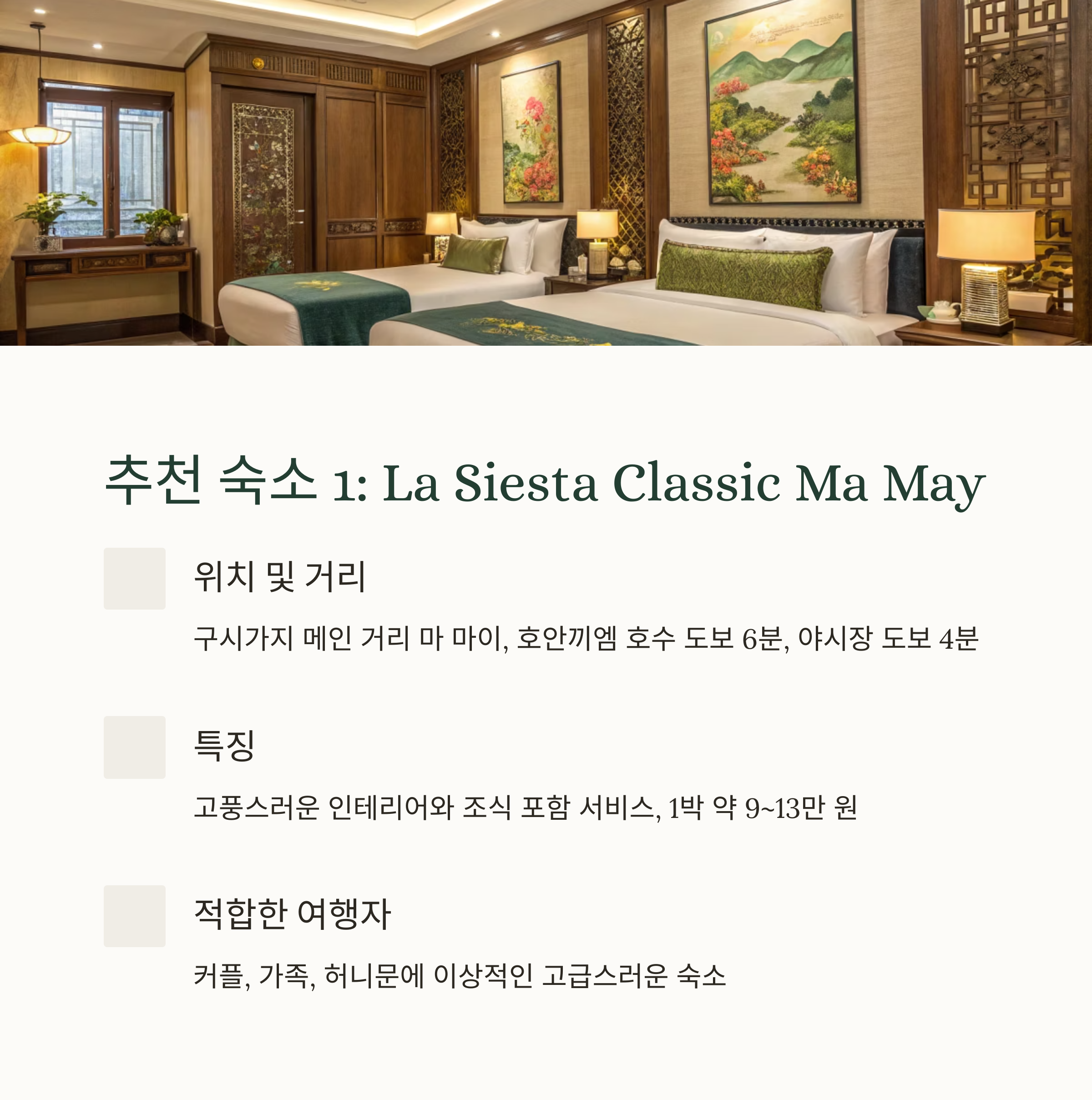 | La Siesta Classic | 도보 6분 | 약 9~13만 원 | 고급스러움, 관광에 최적 |