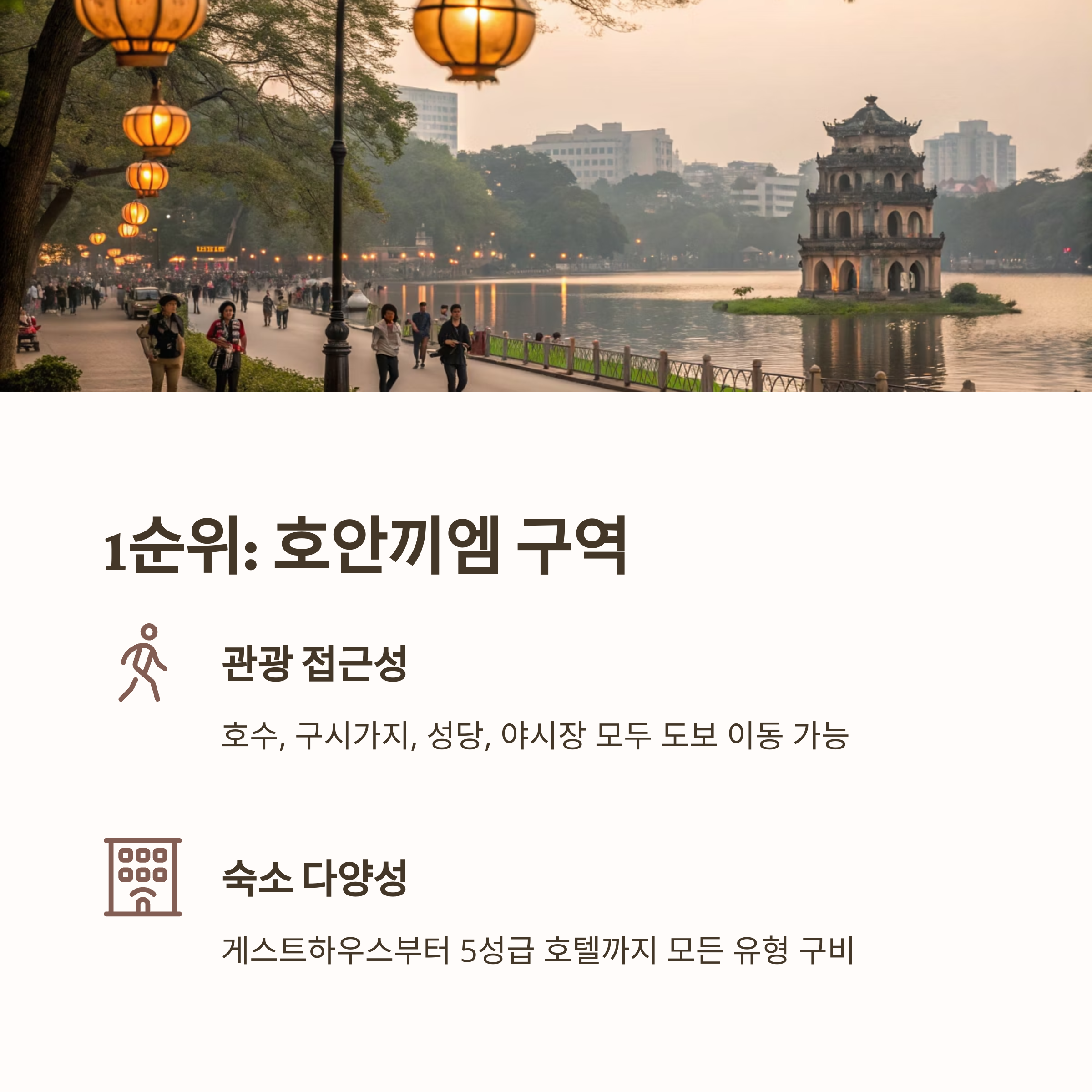 | 호안끼엠 | 최고 | 우수 | 매우 우수 | 처음 방문, 관광 중심 |