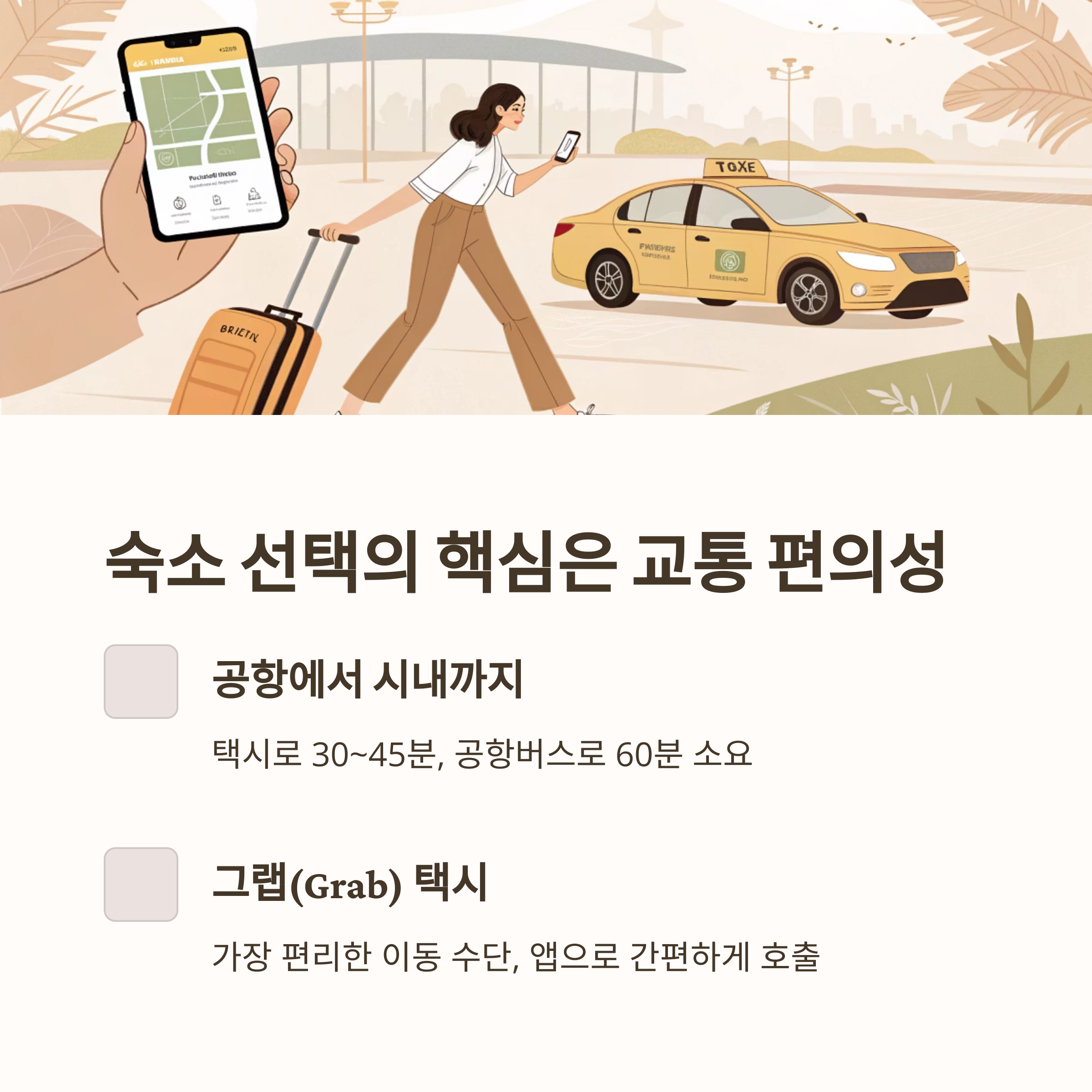 버스 정류장, 택시 탑승지, 그랩 픽업 가능 여부가 중요 - 체크인 시간 유연한지 확인