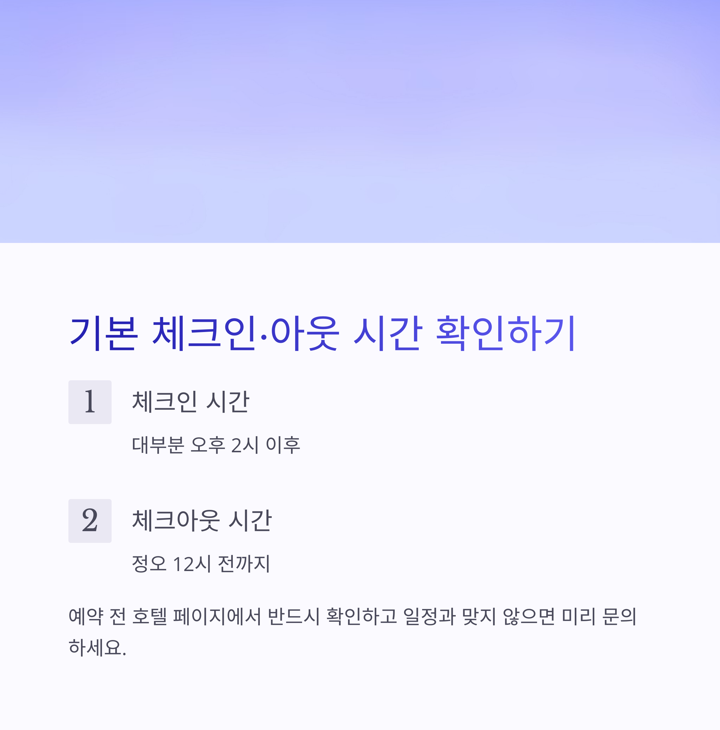대부분의 호텔은 오후 2시 이후 체크인, 정오 12시 체크아웃을 기본으로 하며